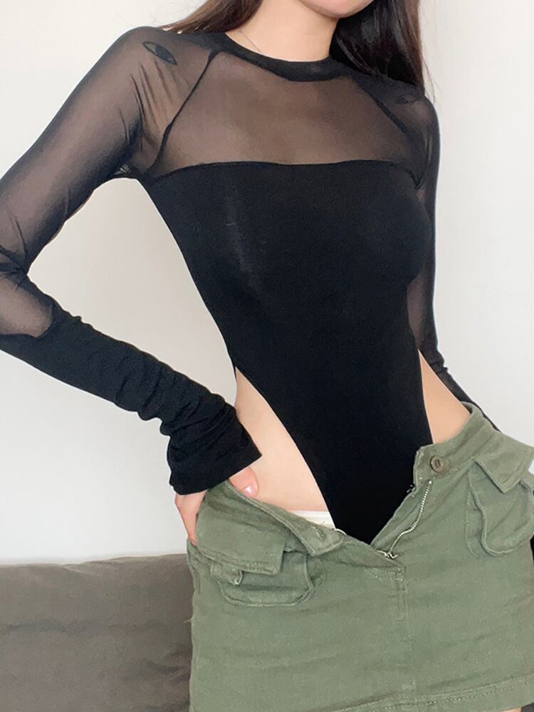 送料無料 ゴスダーク Techwear サイバー Y2k シースルーボディスーツゴシックグランジ美的ボディコン女性 Tシャツ長袖パッチワークボディスーツ ロング AE155588762306749956