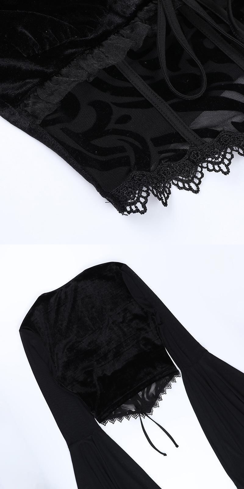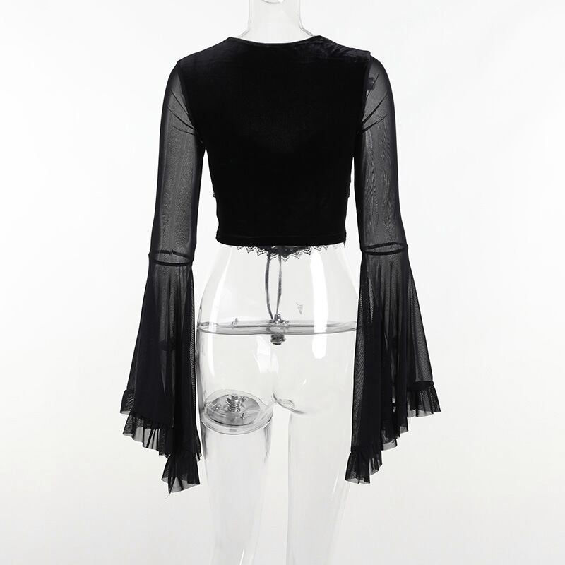 送料無料 ゴスダークベルベットゴシック美的ブラウス包帯メッシュフレアスリーブグランジクロップトップスヴィンテージボディコンオルタナティブTシャツ ビンテージ AE155588798494797688