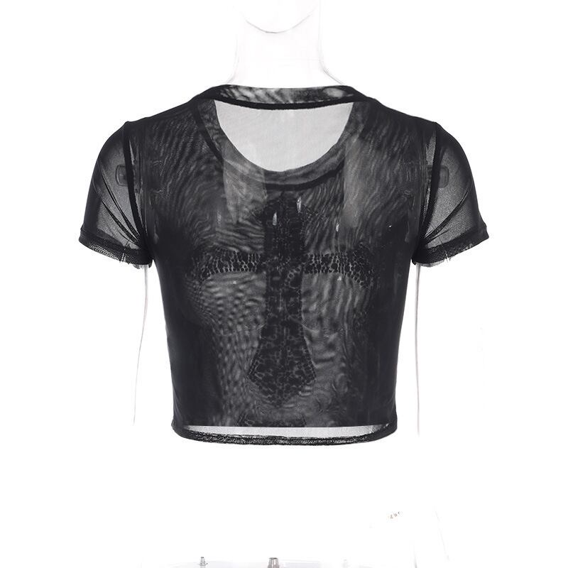 送料無料 ゴスダークヴィンテージサイバー Y2k クロスラインストーン Tシャツゴシックメッシュシースルーセクシーなクロップトップスグランジストリート半袖 Tシャツ ショート ハーフスリーブ ビンテージ AE155588788871690773