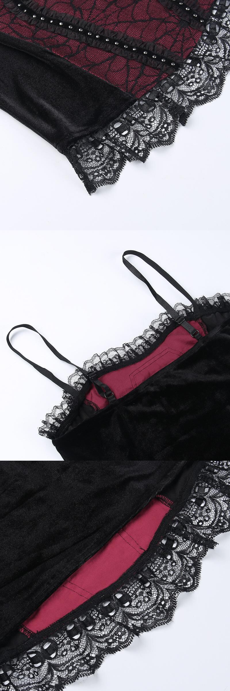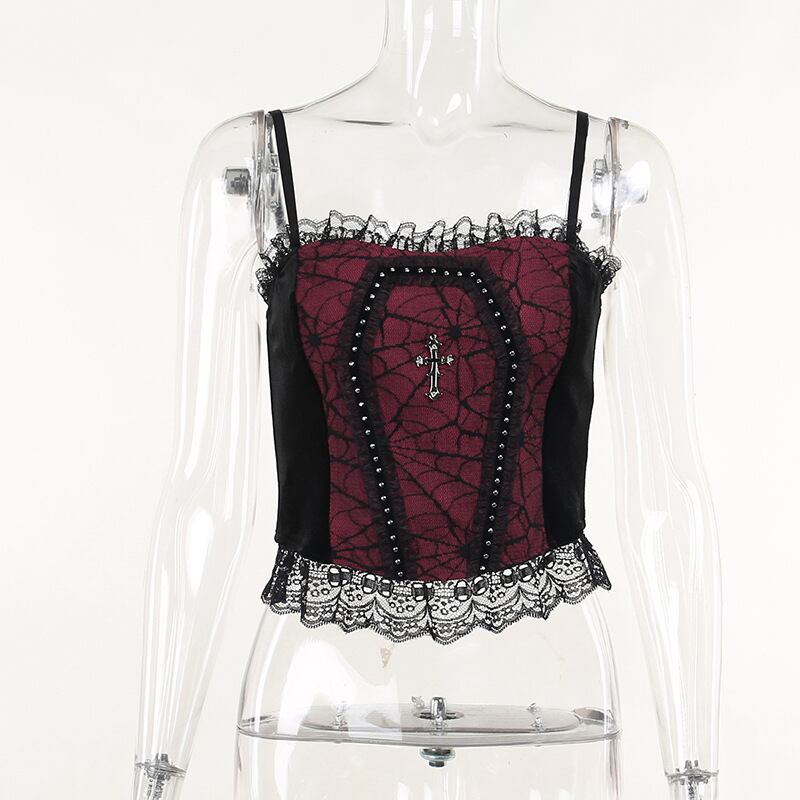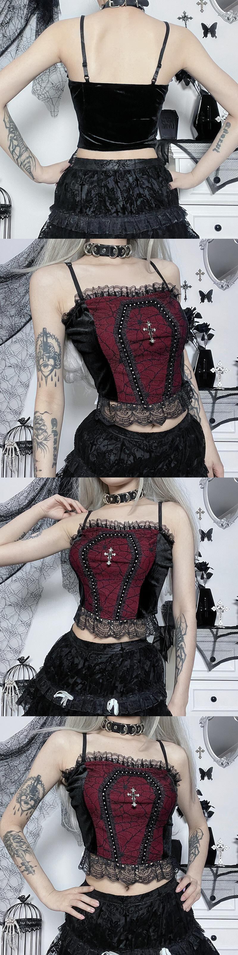 送料無料 ゴス ダーク スパイダー ウェブ パッチワーク モール ゴシック キャミソール グランジ 美的 パンク ベルベット クロップ トップス エモ クロス レース トリム バックレス Alt 服 AE155588752925528382