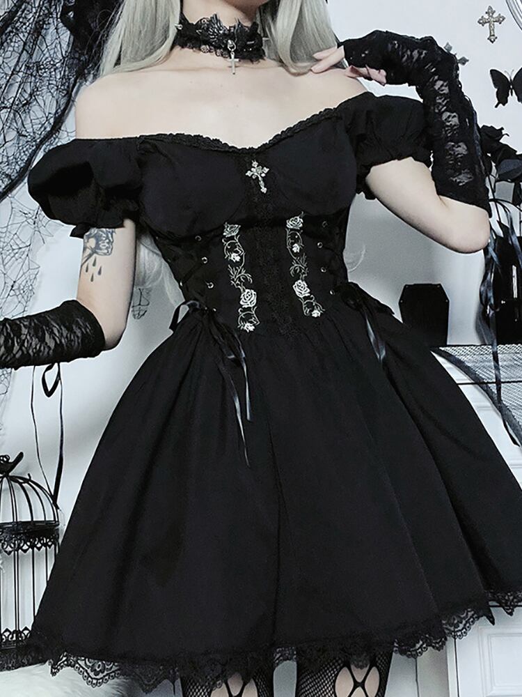 送料無料 ゴスダークロリータモールゴシック A ライン Kwaii ミニドレスグランジスタイル黒包帯コルセットドレス女性エモ刺繍 Alt 服 ブラック Aライン AE155588784128405508
