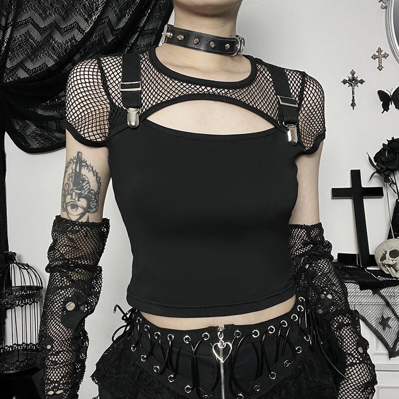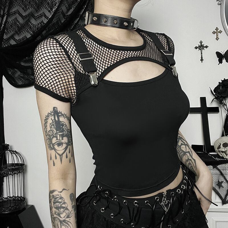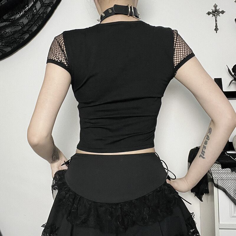 送料無料 ゴスダークモールゴシック網タイツパッチワークブラウス中空アウトセクシーなグランジ美的 Tシャツパンク半袖 E-Alt クロップトップス ショート ハーフスリーブ AE155588715315280