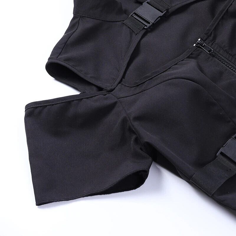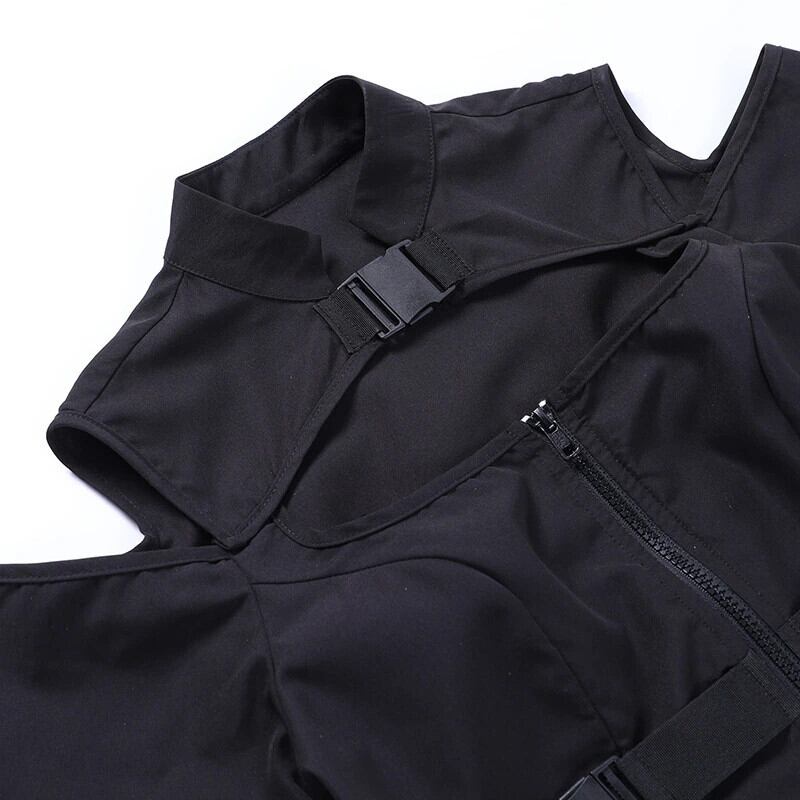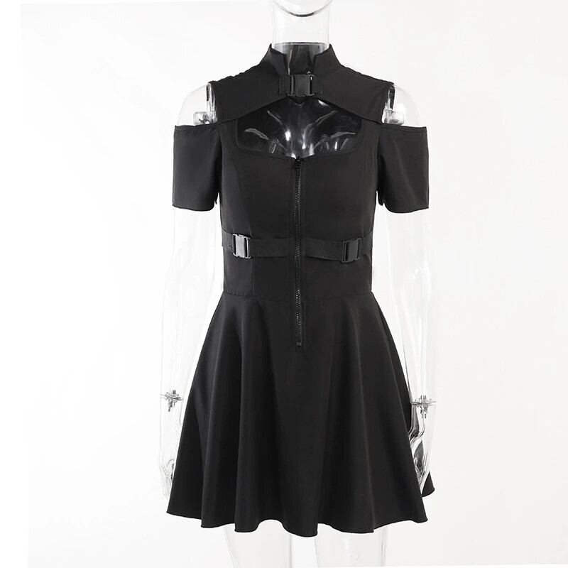 送料無料 ゴスダーク Techwear バックルパッチワーク黒ドレスゴシックグランジオープンショルダー女性ストリートカットアウトジップアップ A ラインパーティードレス ブラック Aライン AE155588744721512962