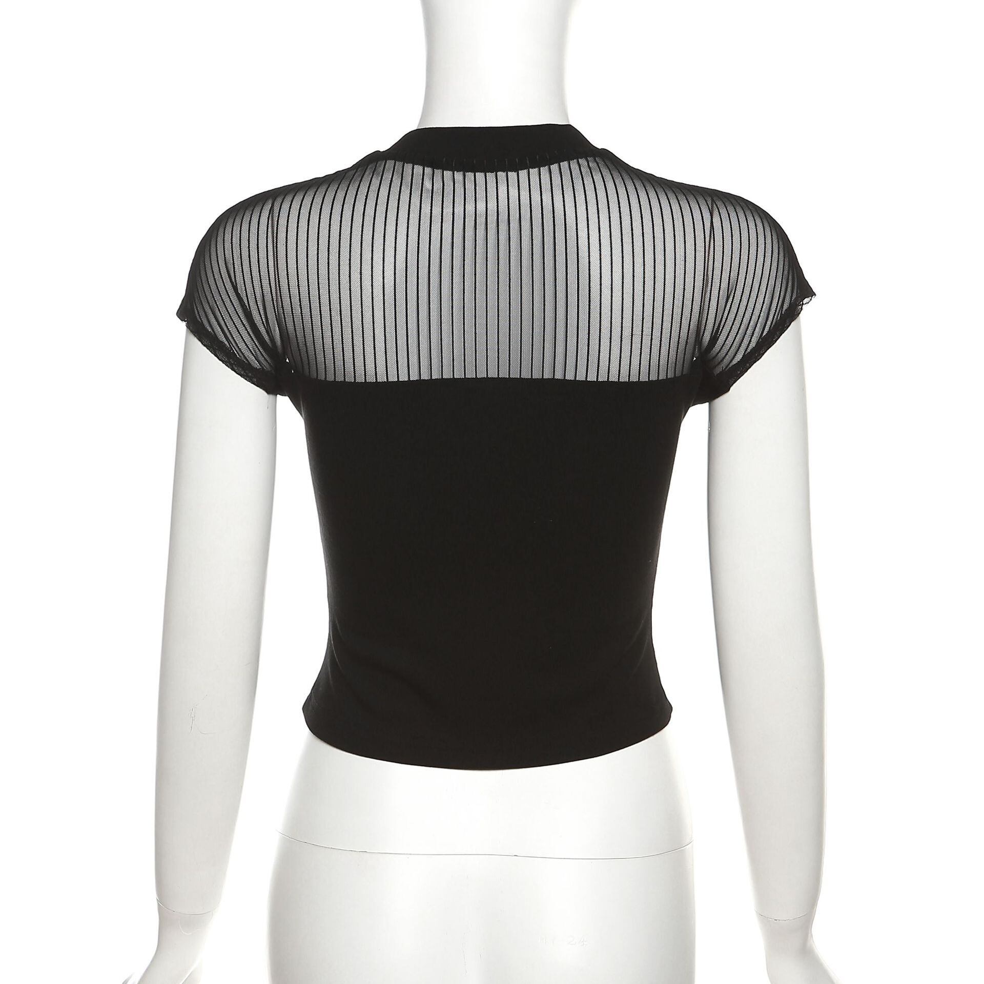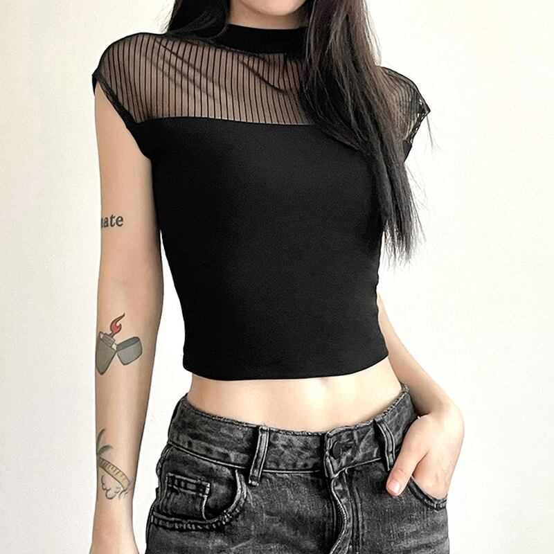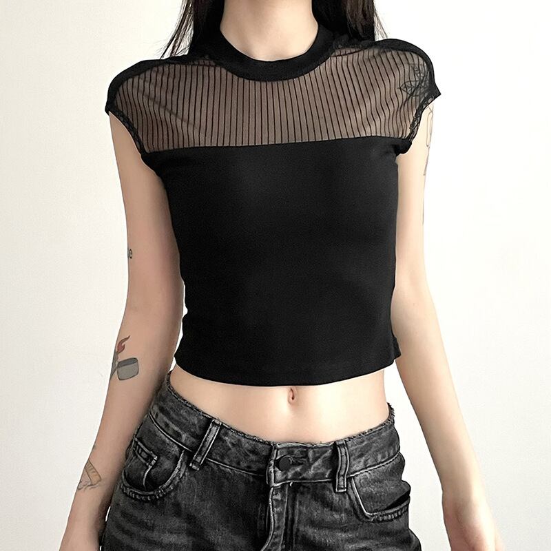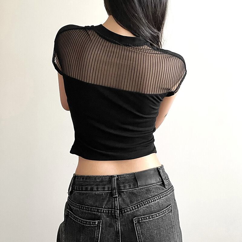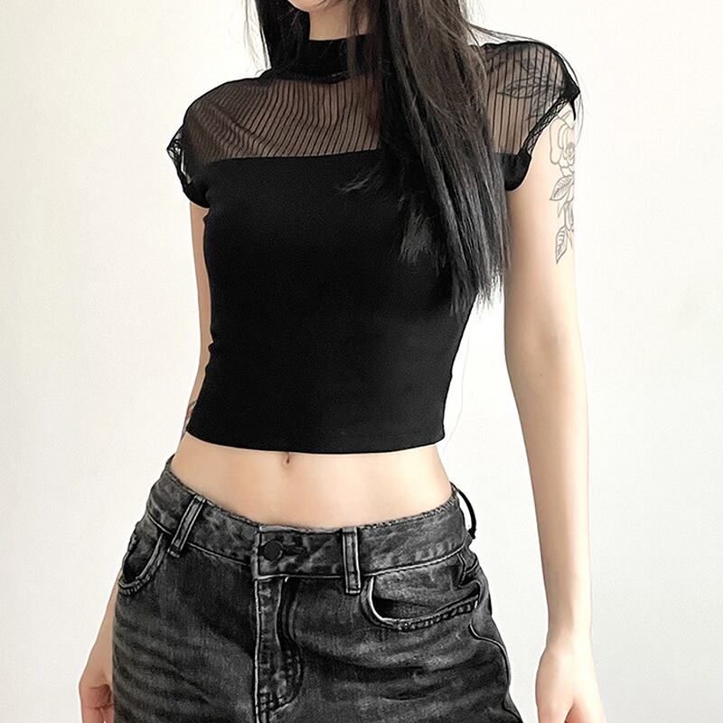 送料無料 ゴスダークゴシックメッシュパッチワークベーシック Tシャツ Y2k パンク黒人女性のセクシーなクロップトップスグランジ半袖ストリートブラウス夏 ショート ブラック ハーフスリーブ サマー 夏物 AE155588785608600434