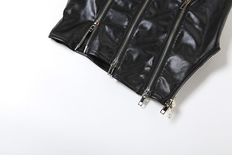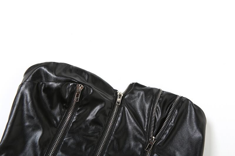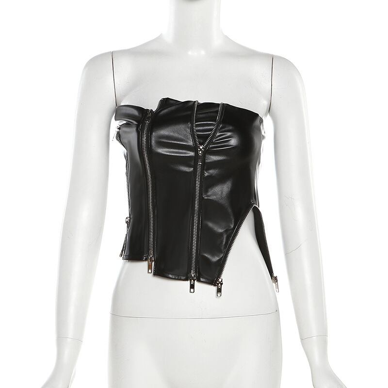 送料無料 ゴスダークサイバー Y2k パンクフェイク Pu ジップアップチューブトップスグランジスタイルゴシック不規則なストラップレスの女性の背中の開いたオフショルダークロップトップ ファー AE155588725915321885