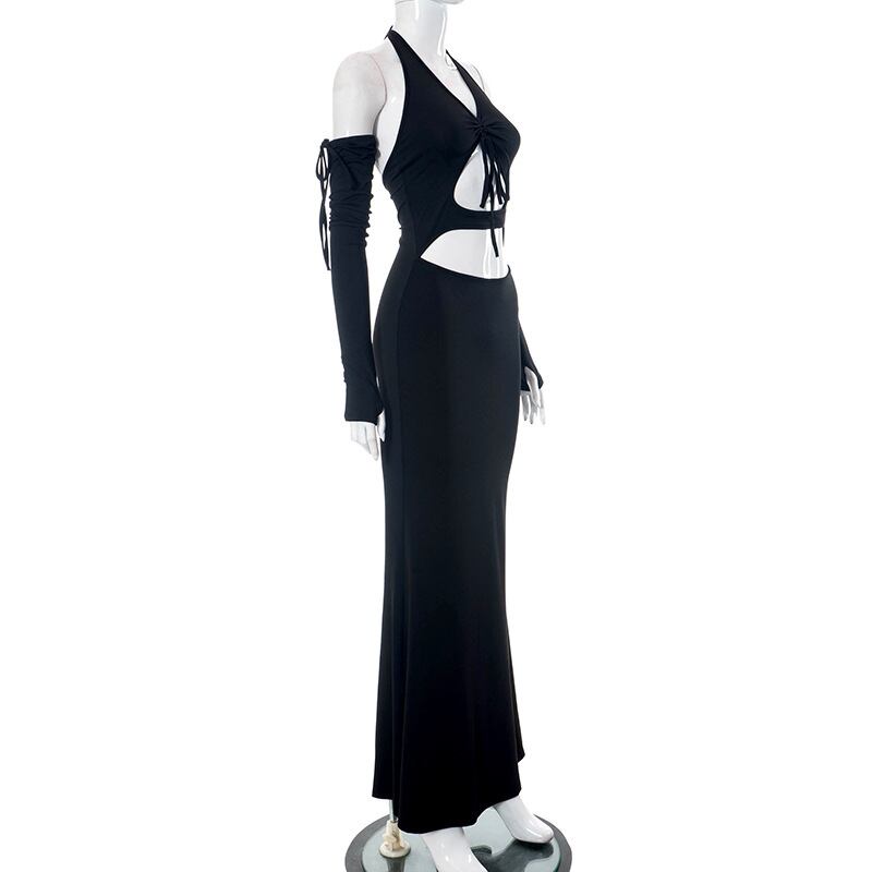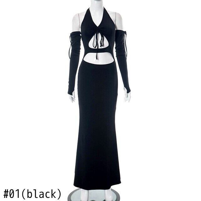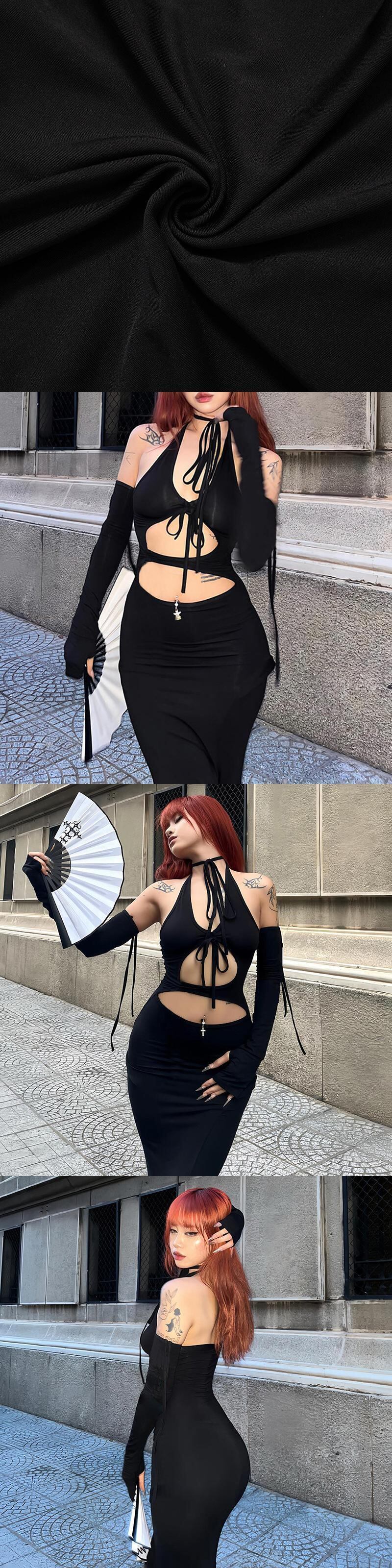 送料無料 ゴスダークサイバーゴシックカットアウトセクシーなホルタードレス Y2k パンク Techwear バックレスロングドレス女性黒レースアップパーティーウェア ブラック AE15558874728913098