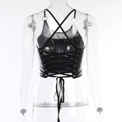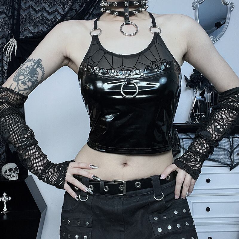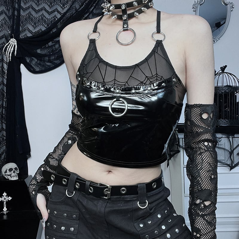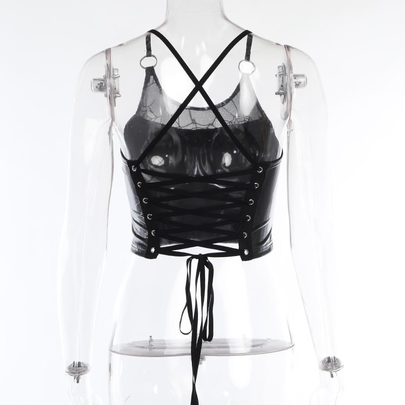 送料無料 ゴスダークパンクスタイルグランジブラック包帯キャミソールモールゴシックフェイク Pu セクシーな背中の開いたクロップトップススパイダーウェブパッチワーク Alt ファー AE155588766036930011
