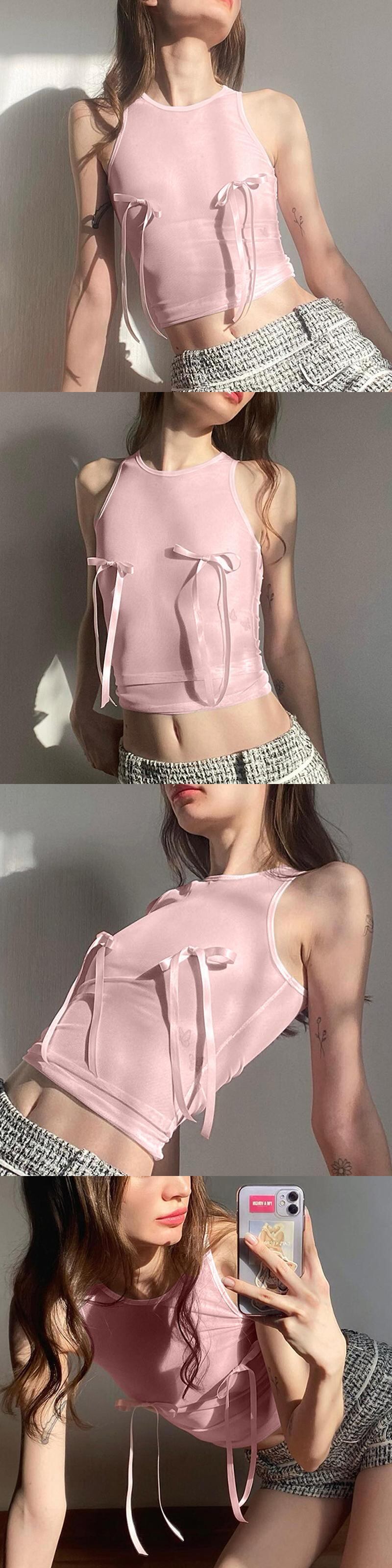 送料無料 ゴスダークボウアップ Y2k ガールかわいい女性タンクトップ 2000 年代美的メッシュセクシーなシースルークロップトップパステルゴシックボディコンピンク服 リボン 大人ガーリー スウィート キュート カジュアル AE155588742928668384