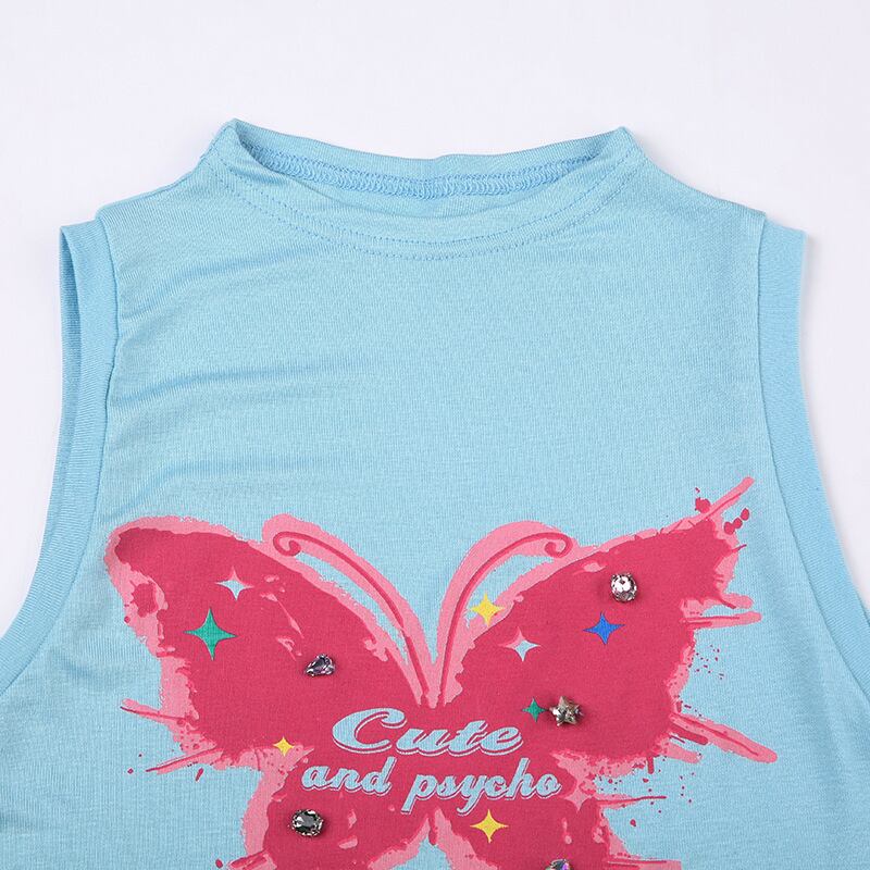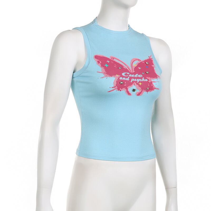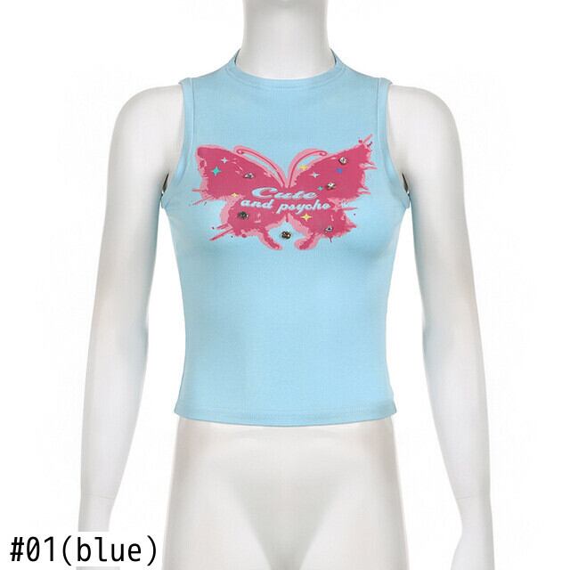 送料無料 ゴスダークダイヤモンド Y2k 蝶プリントタンクトップサイバーゴシックパンクモックネックセクシーなクロップトップ女性ベビーブルーストリート AE155588716058456119