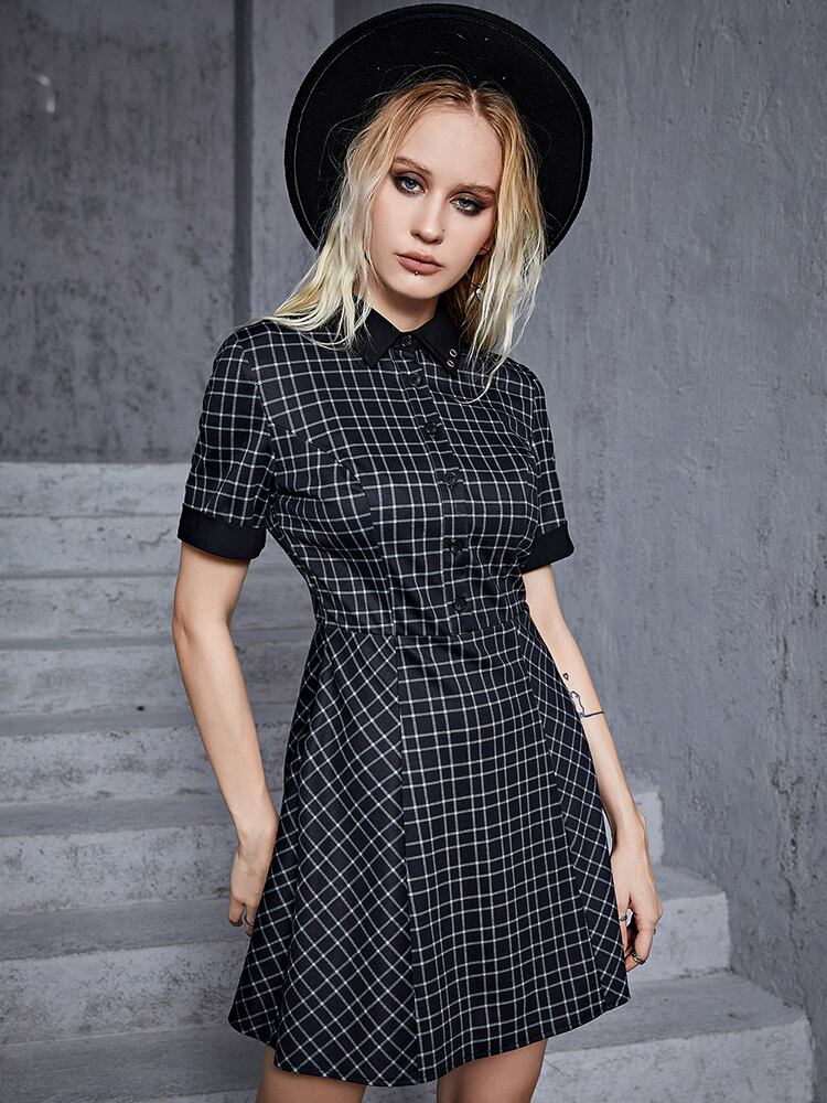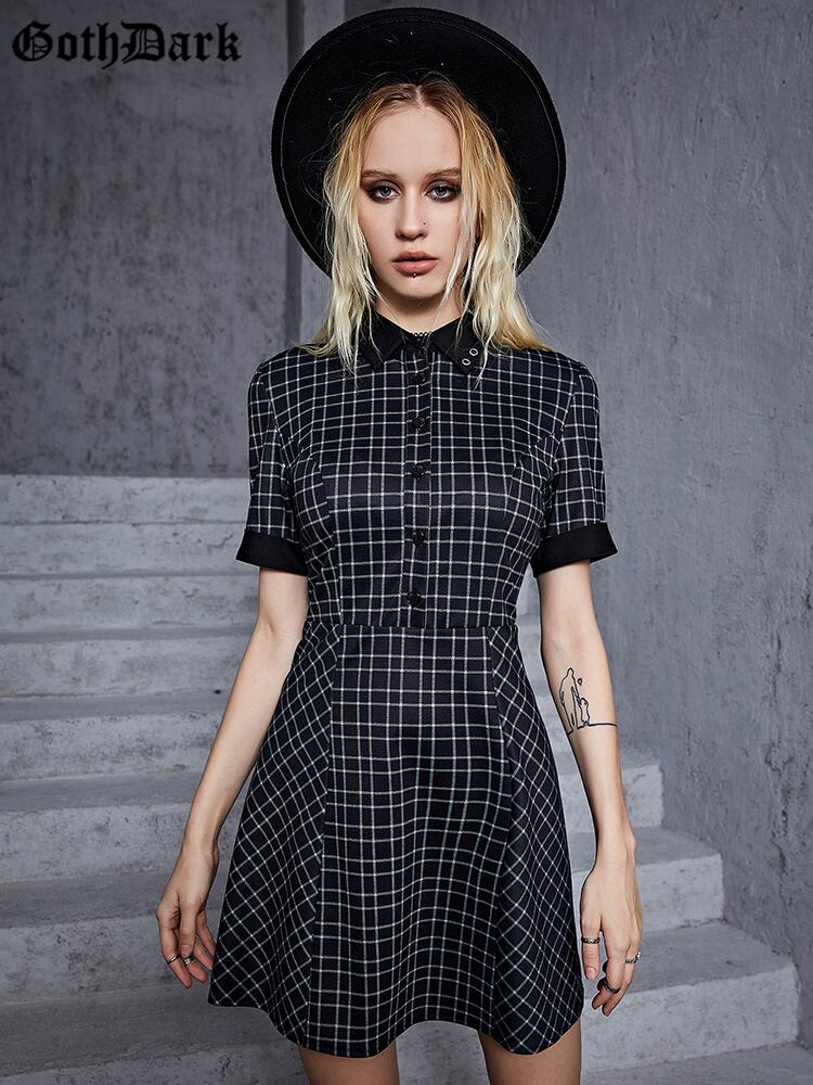 送料無料 ゴスダークパンクチェック柄モールゴシック美的ミニドレスグランジスタイル半袖女性シャツドレスパーティーウェア代替衣装 ショート ハーフスリーブ AE155588764685479756