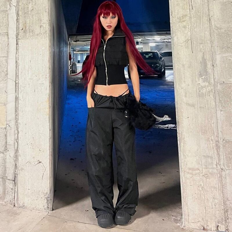 送料無料 ゴスダークサイバーゴシックジップアップノースリーブコート Y2k パンクターンダウン襟スキニーパッド入りジャケット女性 Techwear ふくらんベスト AE155588738042596883