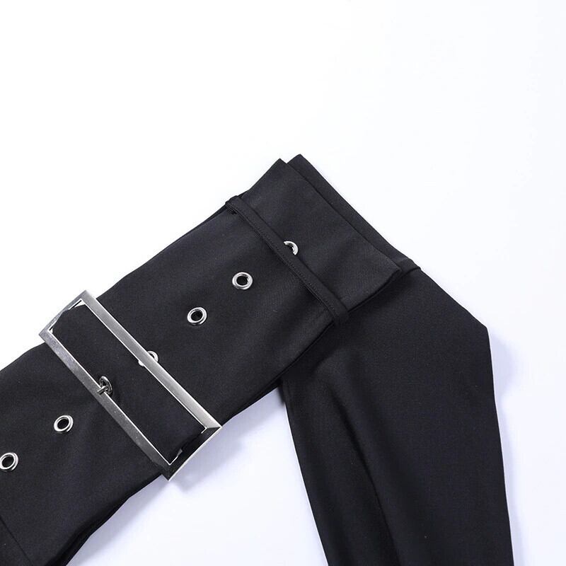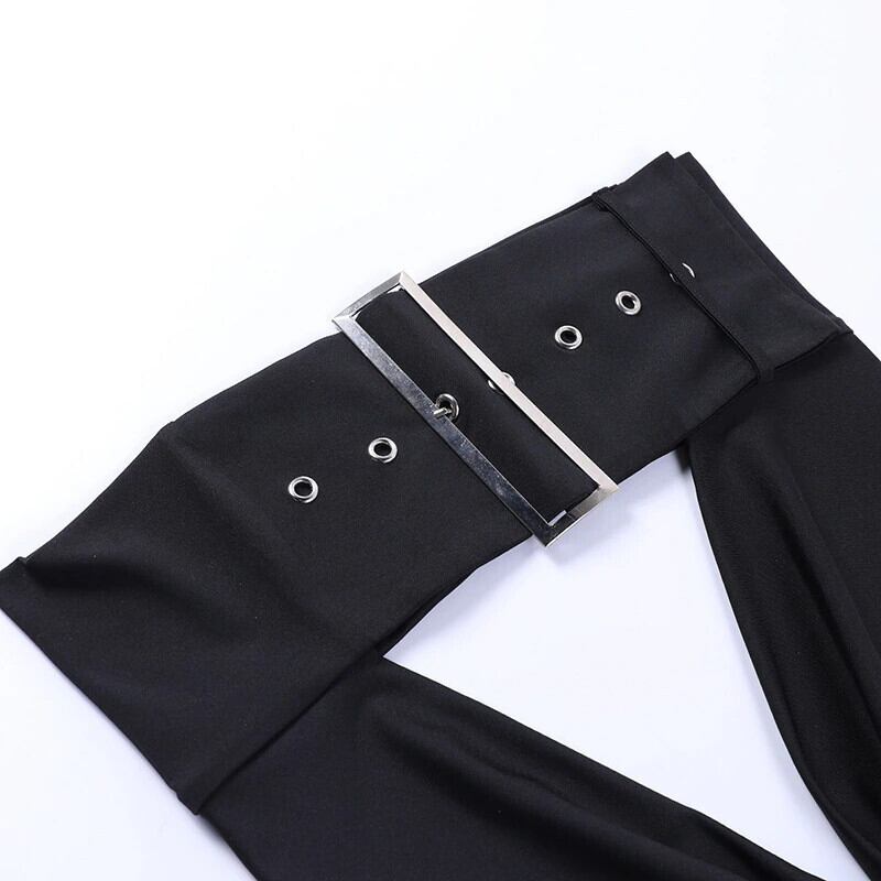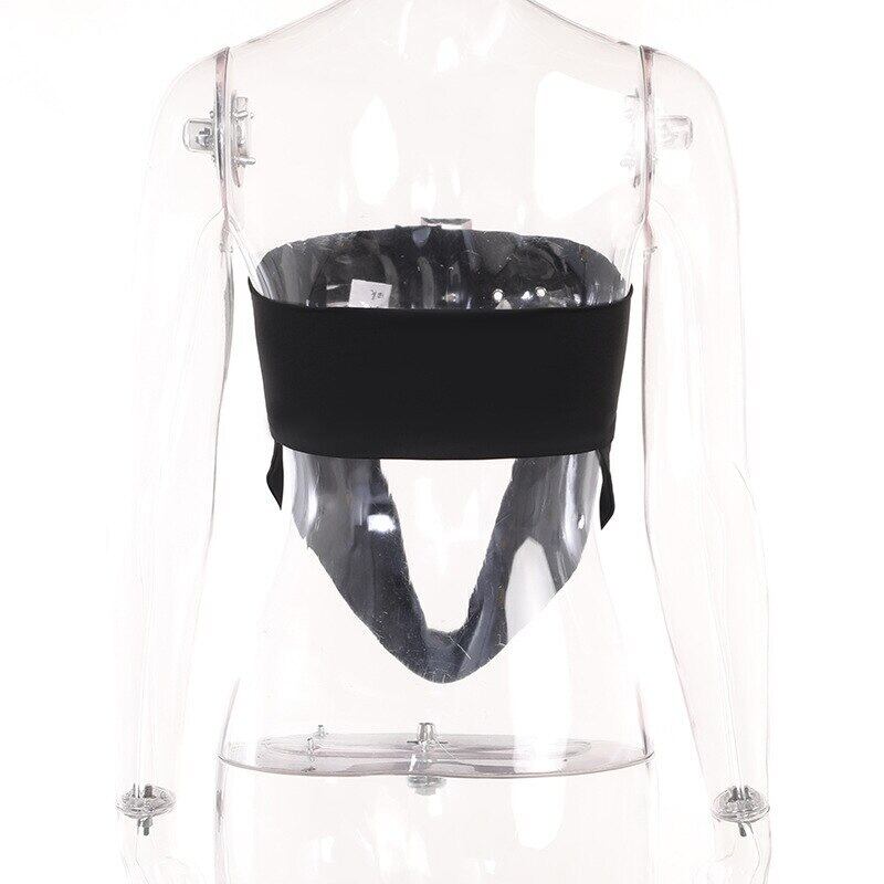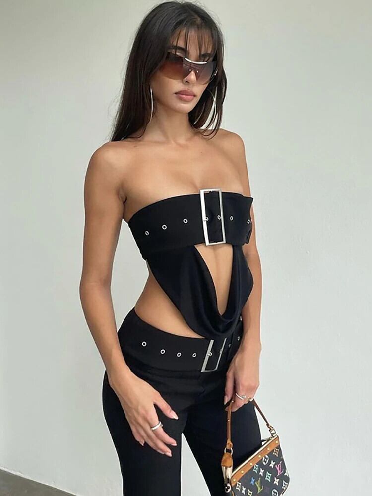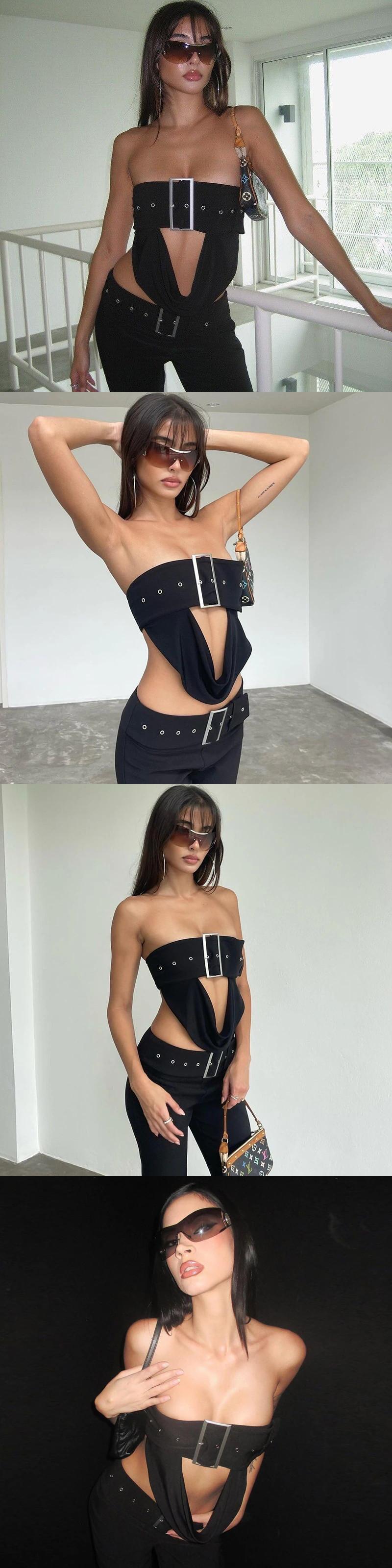 送料無料 ゴスダークサイバー Y2k パンクスクエアバックルチューブトップスゴシック中空アウト女性ストラップレススリム背中の開いたセクシーなストリート黒クロップトップ ブラック スクウェア AE155588756970378623