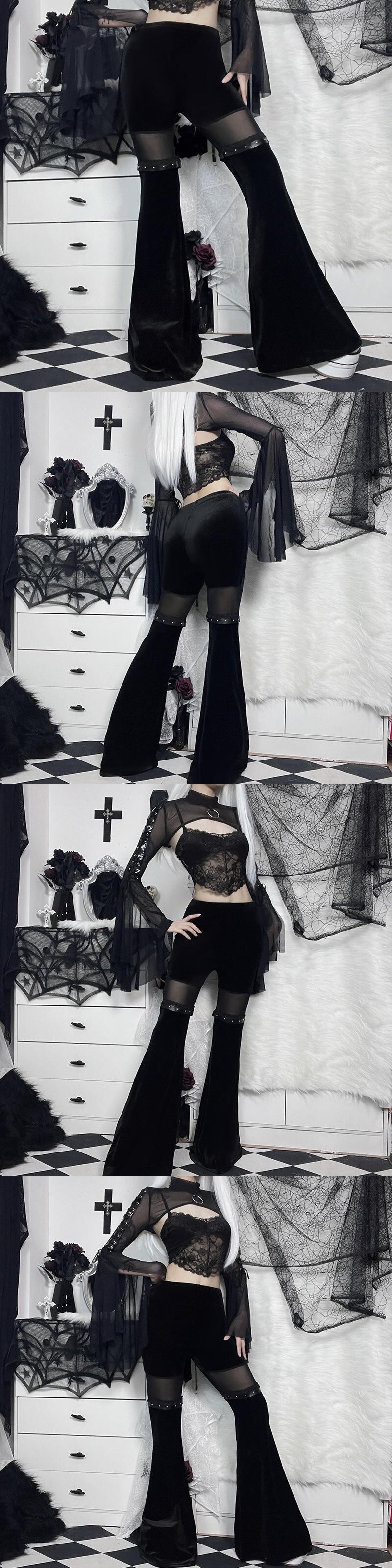 送料無料 ゴスダークゴージャスな Tra モールゴシックベルベットフレアパンツグランジ美的メッシュスプライス女性ズボンウエスト黒 Alt 服 ブラック AE155588748331239762 | 女性の為の通販サイト-fashion navi