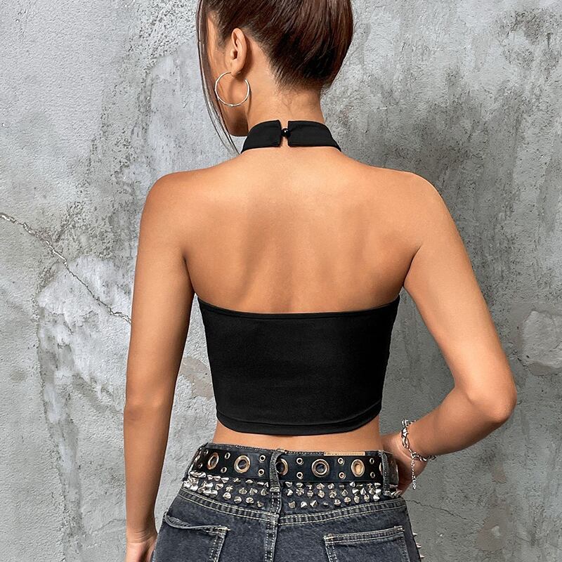 送料無料 ゴスダークパンクスタイル網タイツ女性のセクシーなホルタートップスモールゴシックグランジ美的背中の開いたクロップトップエモプリントe Alt服 AE155588760619939022