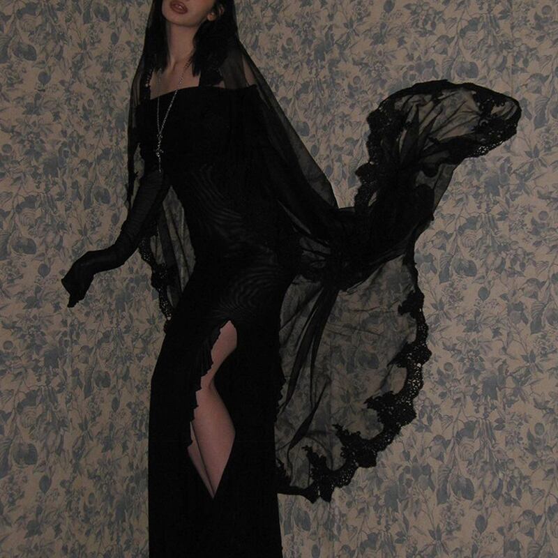 送料無料 ゴスダークオフショルダーモールゴシックパーティーミディドレス Y2k メッシュシースルーセクシーなドレスの女性グランジスプリットフリル衣装 ラッフル AE155588744943223998