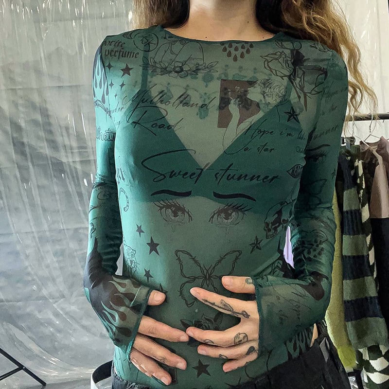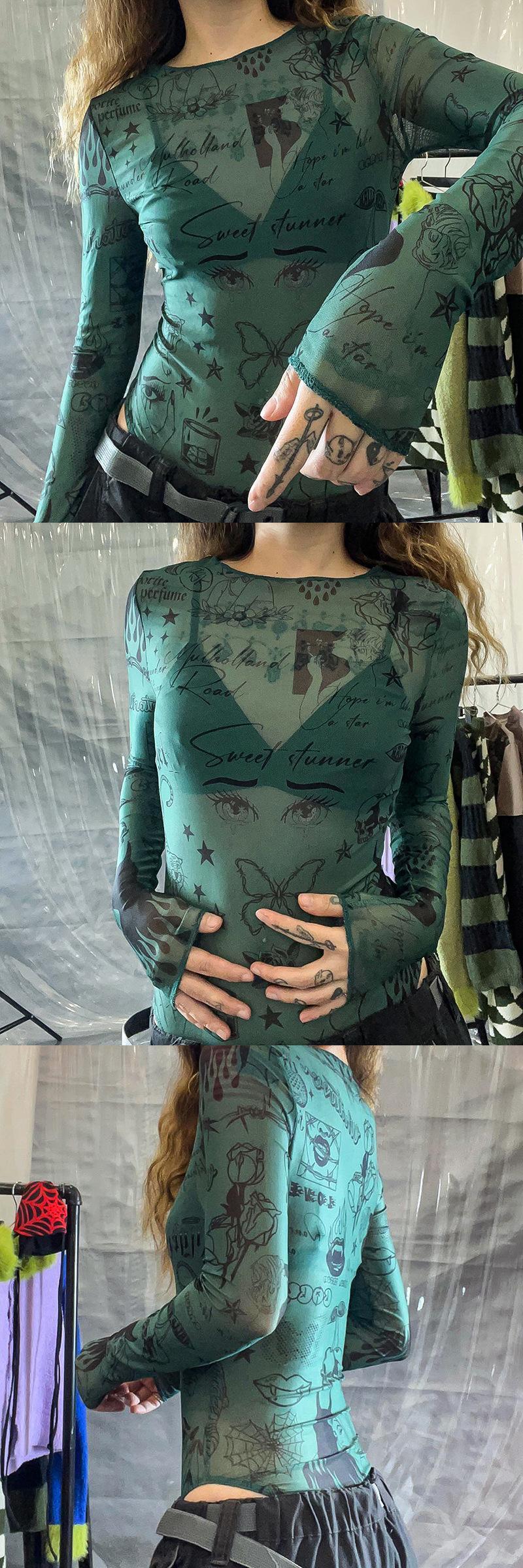 送料無料 ゴスダーク妖精グランジ Y2k メッシュ Transprent ボディスーツヴィンテージプリントゴシックパンクセクシーな Tシャツ女性長袖スキニーボディスーツ ロング ビンテージ AE155588785149000634