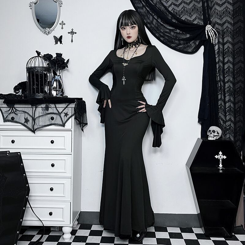 送料無料 ゴスダークモールゴシックイブニングマーメイドドレスグランジ美的バタフライスリーブドレス女性黒パーティースリムalt衣装 ブラック AE155588729843761094