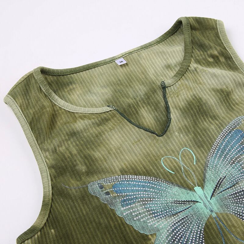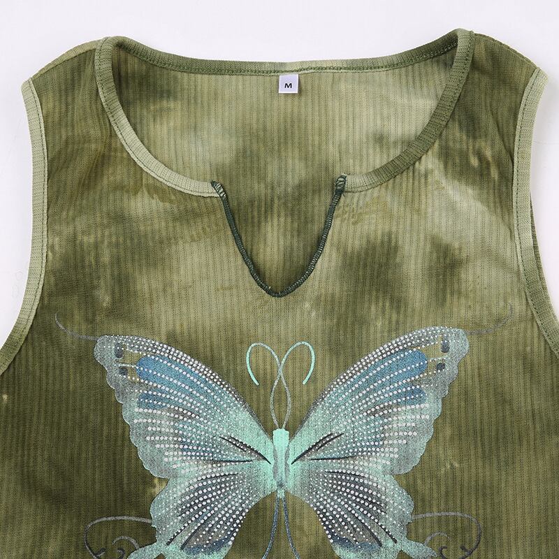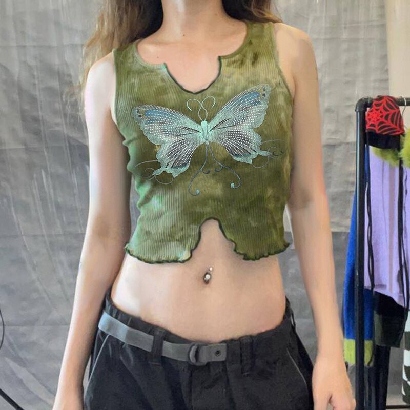 送料無料 ゴスダークゴブリンコア美的タイダイタンクトップ Y2k フェアリーコアバタフライプリントクロップトップノッチネックスリムセクシーな衣装 AE155588725480753713