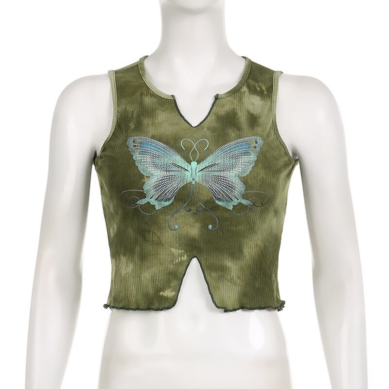 送料無料 ゴスダークゴブリンコア美的タイダイタンクトップ Y2k フェアリーコアバタフライプリントクロップトップノッチネックスリムセクシーな衣装 AE155588725480753713 | 女性の為の通販サイト-fashion navi