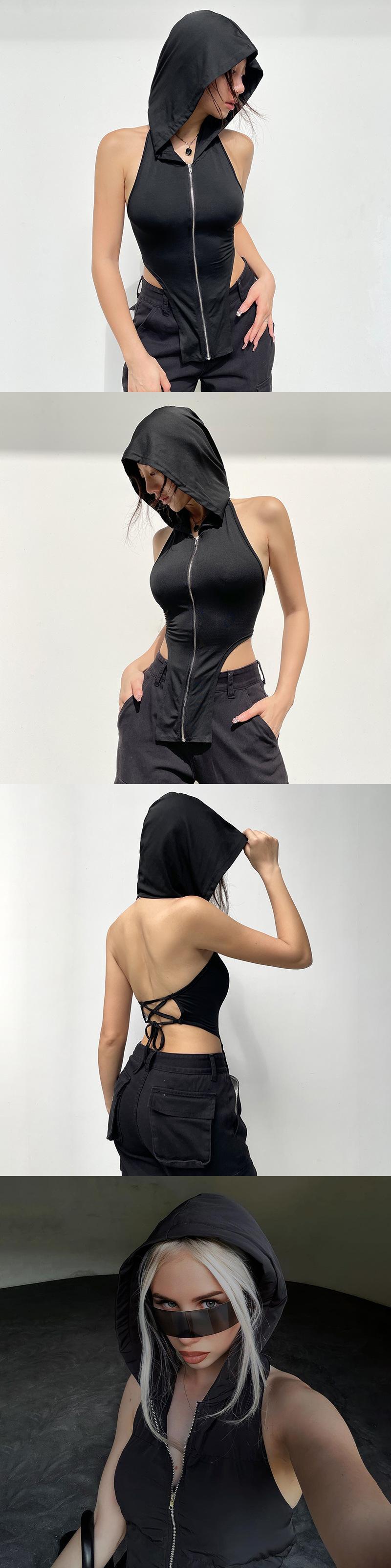 送料無料 ゴスダークサイバー Y2k パンク背中の開いたセクシーな Tシャツゴシックグランジフード付きジップアップクロップトップステックウェア包帯ストリートウェア AE155588780167454623