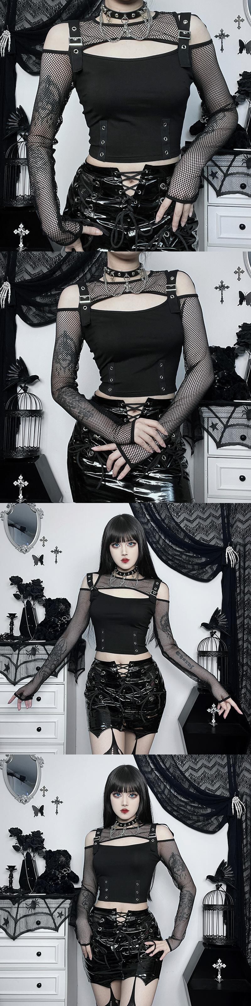 送料無料 ゴスダークモールゴシック網タイツパッチワーク Tシャツグランジパンク中空バックルクロップトップス Techwear Alt ストリート AE155588714374401276