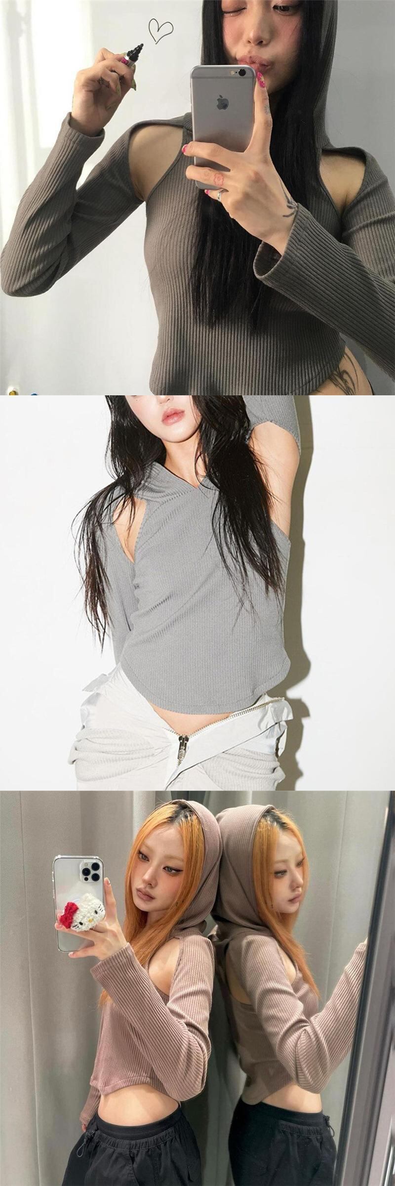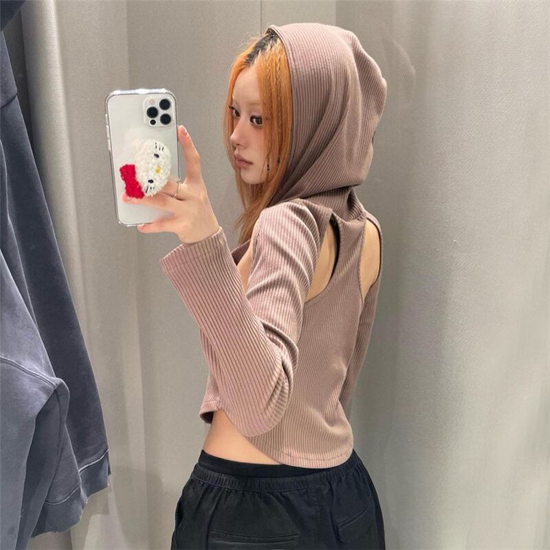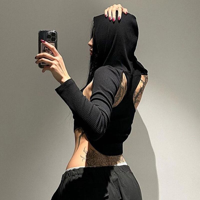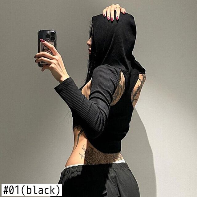 送料無料 ゴスダーク Acubi 中空アウトクロップトップスストリート Y2k フード付きセクシーな Tシャツゴシック長袖カーブ裾プルオーバー ロング AE155588730204320703