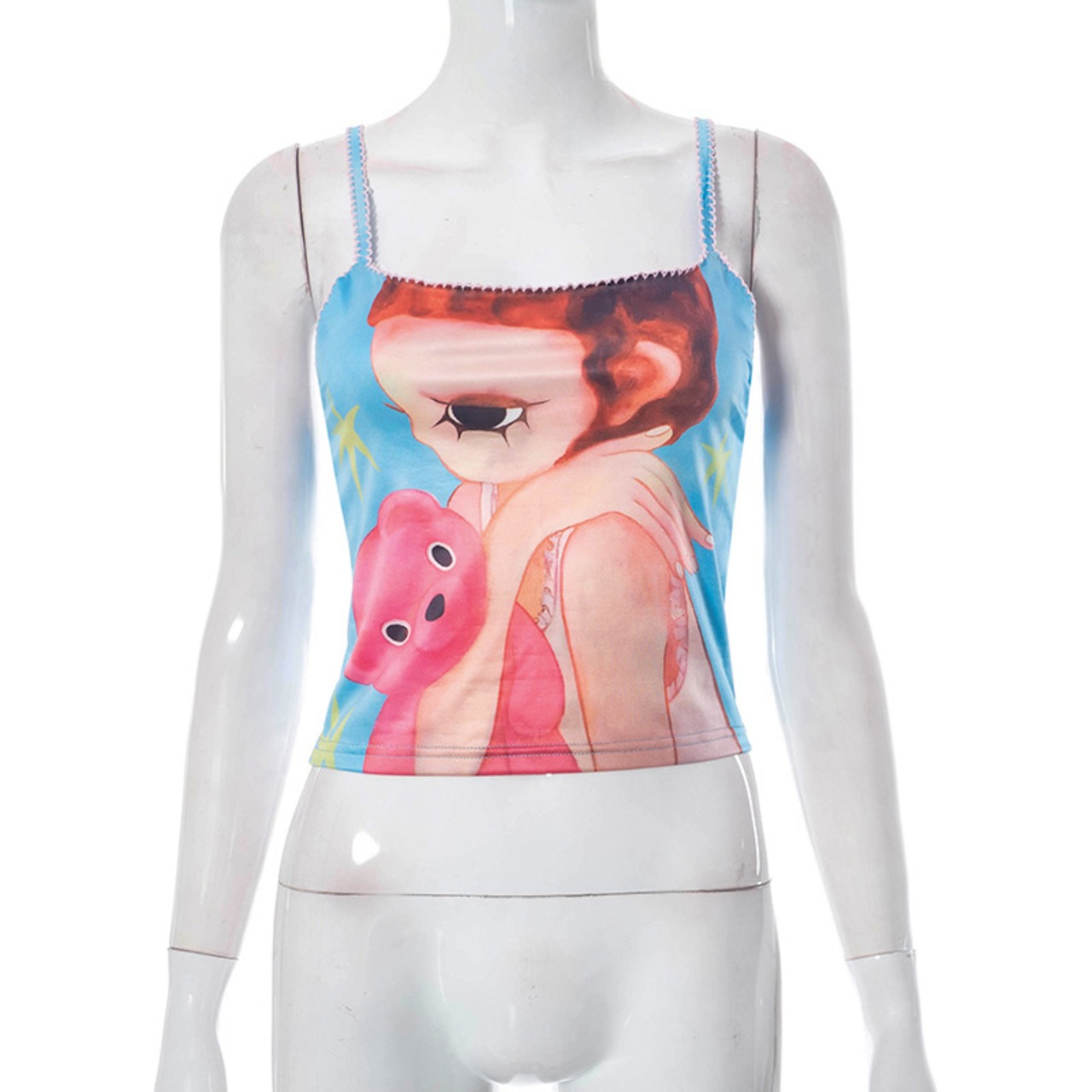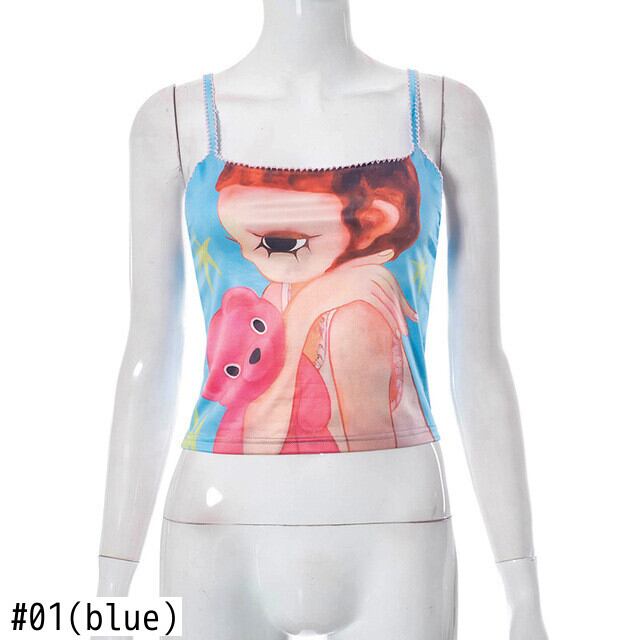 送料無料 ゴスダーク ese Y2k ガールかわいい漫画グラフィックキャミソールゴシックストリートスキニーかわいいクロップトップスカラーマッチノースリーブ 大人ガーリー スウィート キュート カジュアル AE155588760778879359