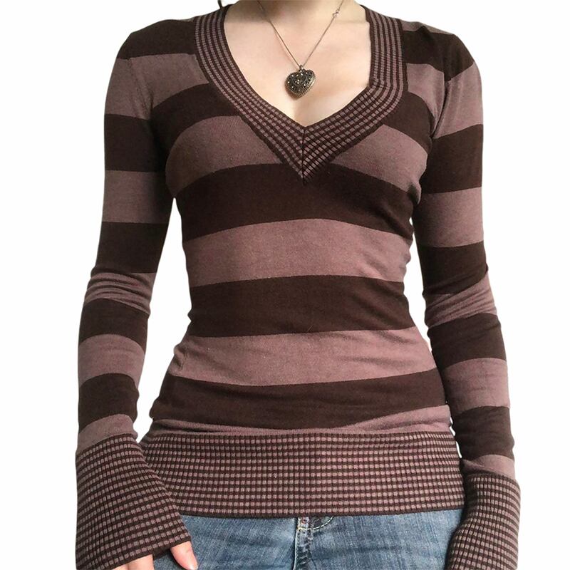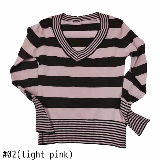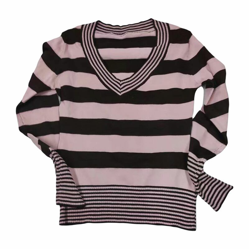 送料無料 ゴスダークフェアリーコアストライプニット Tシャツグランジ Y2k レトロ V ネックカラーマッチセーター女性長袖スキニー衣装 ロング Vネック AE155588718837323604
