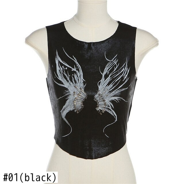送料無料 ゴスダーク妖精グランジ Y2k 翼プリントタンクトップモールゴシック美的ピン黒クロップトップ女性パンク湾曲した裾ストリートベスト ブラック AE155588786253360838 | 女性の為の通販サイト-fashion navi