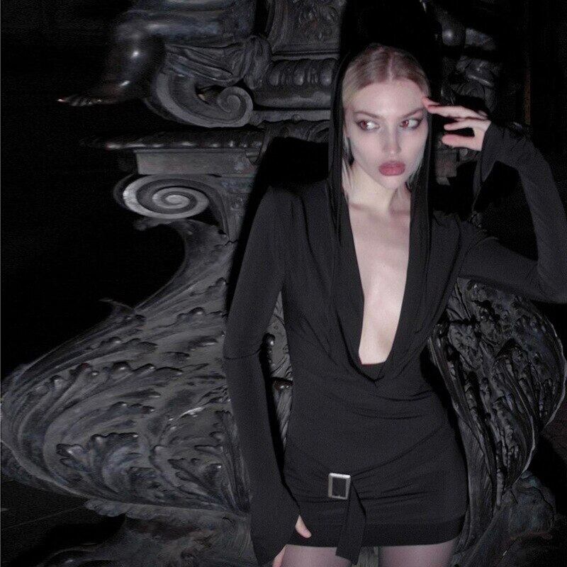 送料無料 ゴスダークモールゴシックディープ V ネックセクシーなミニドレスヴァンパイアフード付き長袖パーティードレスグランジボディコンバックル女性 ロング Vネック AE155588721684938897
