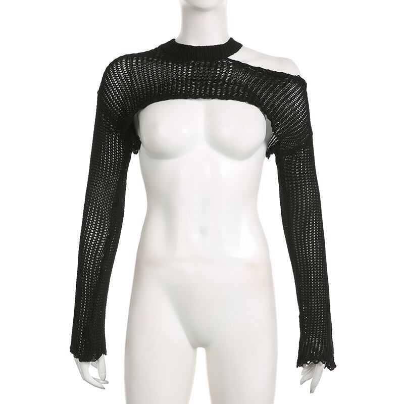 送料無料 ゴスダーク中空アウトサイバー Y2k 作物スモックトップスニットゴシックパンクセクシーなワンショルダーセーター長袖ストリート黒布 ロング ブラック AE155588776732036276 | 女性の為の通販サイト-fashion navi