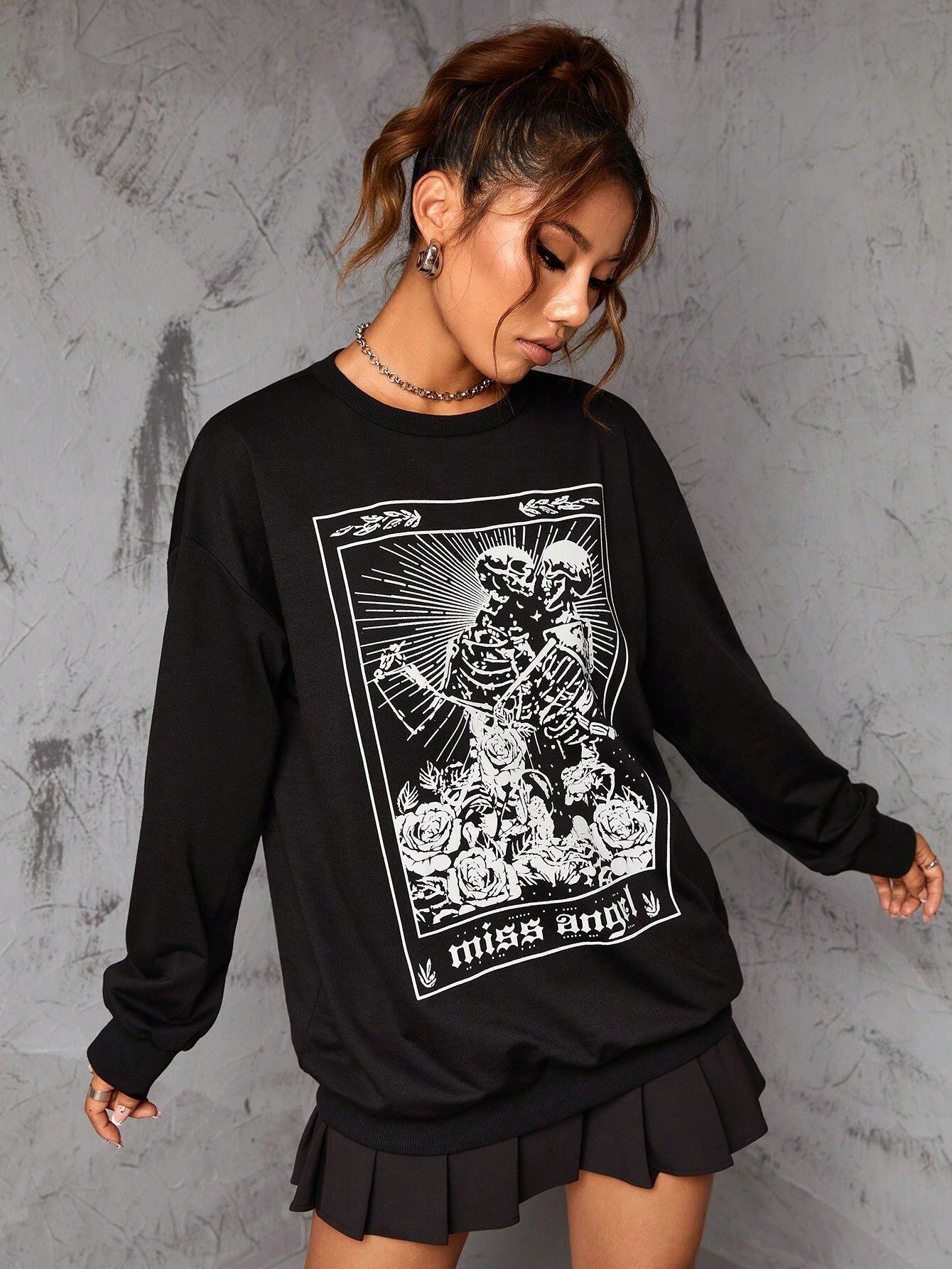 送料無料 ゴスダークスカルエモルースモールゴシックスウェットグランジスタイル女性ヴィンテージプルオーバーパンクストリート黒代替服パーカー ブラック シャツ ビンテージ AE155588784193528697