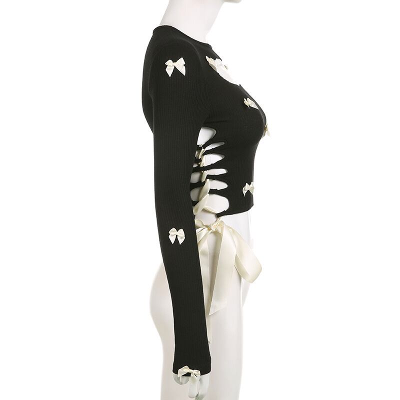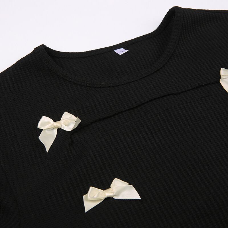 送料無料 ゴスダークモールゴシック弓かわいい原宿 Tシャツ Y2k 包帯カットアウトセクシーなワッフルクロップトップスロリータ女性長袖ボディコン Tシャツ ロング リボン 大人ガーリー スウィート キュート カジュアル AE155588735673943211