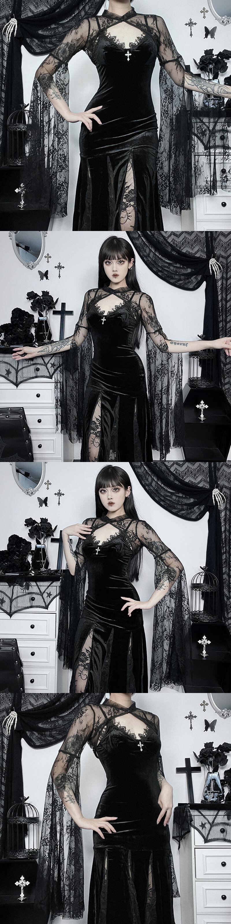 送料無料 ゴスダークレースシースルークロップブラウスモールゴシックフレアスリーブセクシーなすくめトップス花パーティー代替服 花柄 AE15558874694481209
