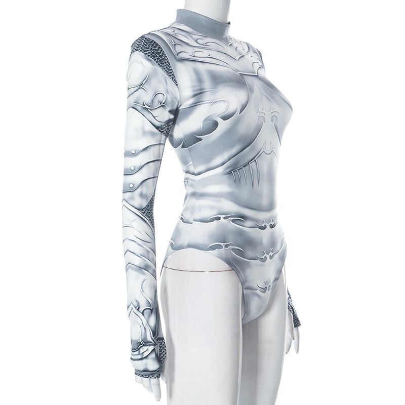 送料無料 ゴスダーク Techwear プリント Y2k ボディスーツサイバーゴシックパンク長袖 Tシャツボディコン女性グランジストリートボディスーツ ロング AE155588780266883120