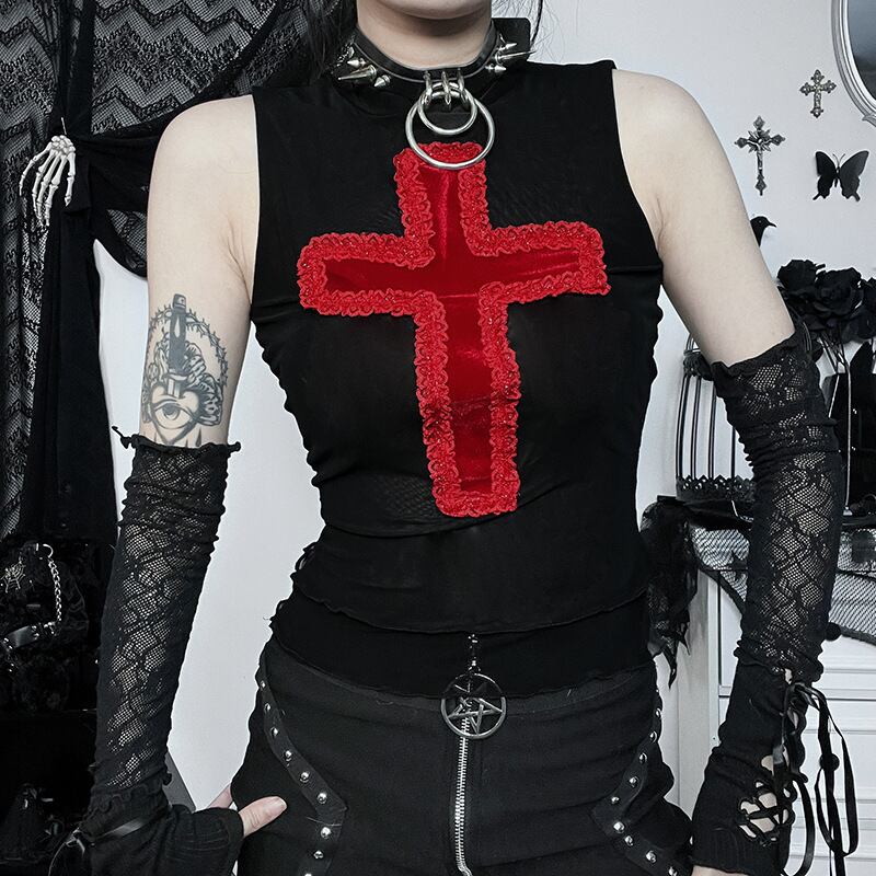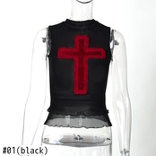 送料無料 ゴスダークメッシュシアーモールゴシック美的タンクトップグランジクロスパッチワークセクシーなクロップトップ女性レタス裾オルトストリートベスト AE155588732720236923