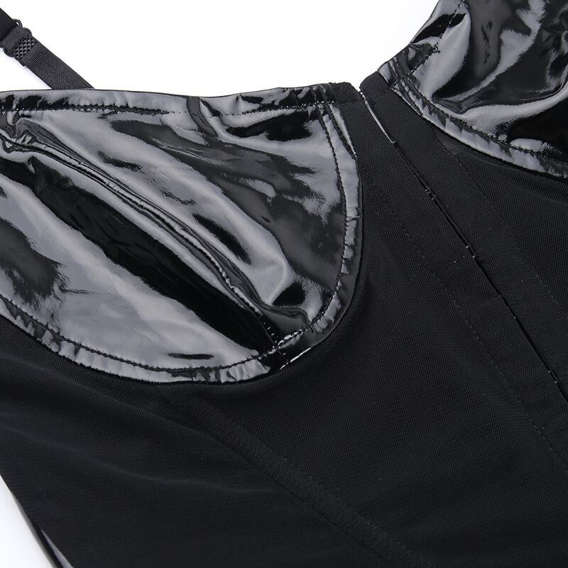 送料無料 ゴスダークグランジスタイルセクシーな薄手の女性コルセットトップスモールゴシックフェイク Pu メッシュパッチワークキャミソールパンクボディコンナイトクラブクロップ衣装 ファー AE155588711053064059