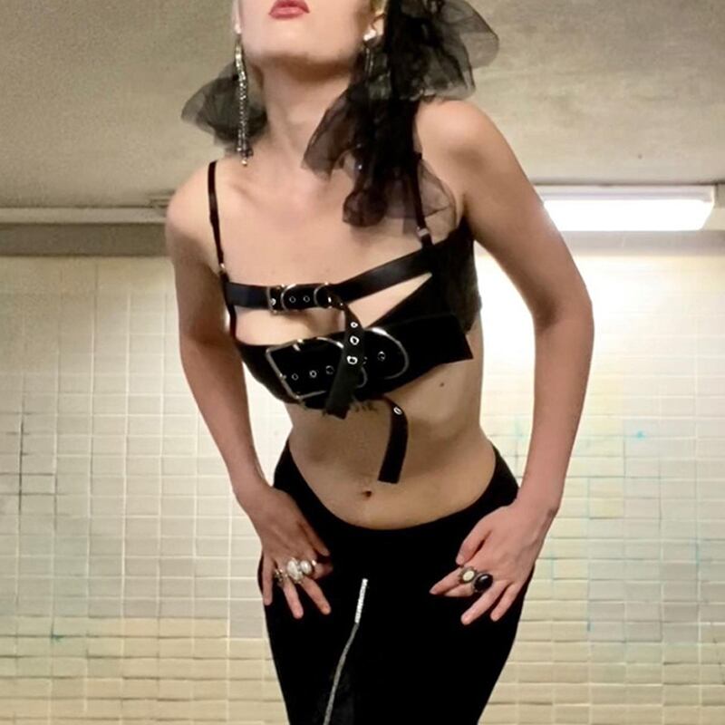 送料無料 ゴス ダーク グランジ 美的 フェイク Pu セクシー キャミソール モール ゴシック サイバー Y2k バックル クロップ トップス パンク クラブ 中空アウト オルタナティブ ストリートウェア ファー AE155588790298052204