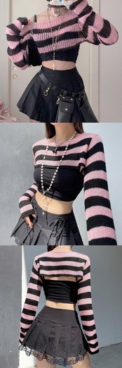 送料無料 ゴスダークパステルゴシックストライプパンク作物すくめトップスくだらない Y2k ピンク黒ニットプルオーバー女性原宿かわいいルーズ秋トップ ブラック 大人ガーリー スウィート キュート カジュアル AE155588735667527260 | 女性の為の通販サイト-fashion navi