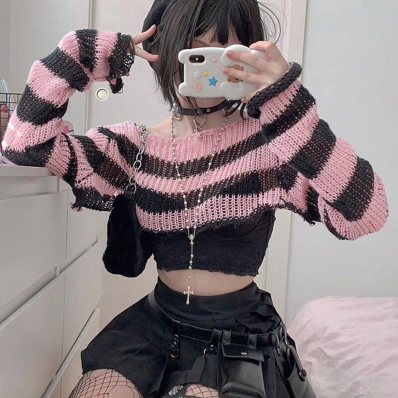 送料無料 ゴスダークパステルゴシックストライプパンク作物すくめトップスくだらない Y2k ピンク黒ニットプルオーバー女性原宿かわいいルーズ秋トップ ブラック 大人ガーリー スウィート キュート カジュアル AE155588735667527260