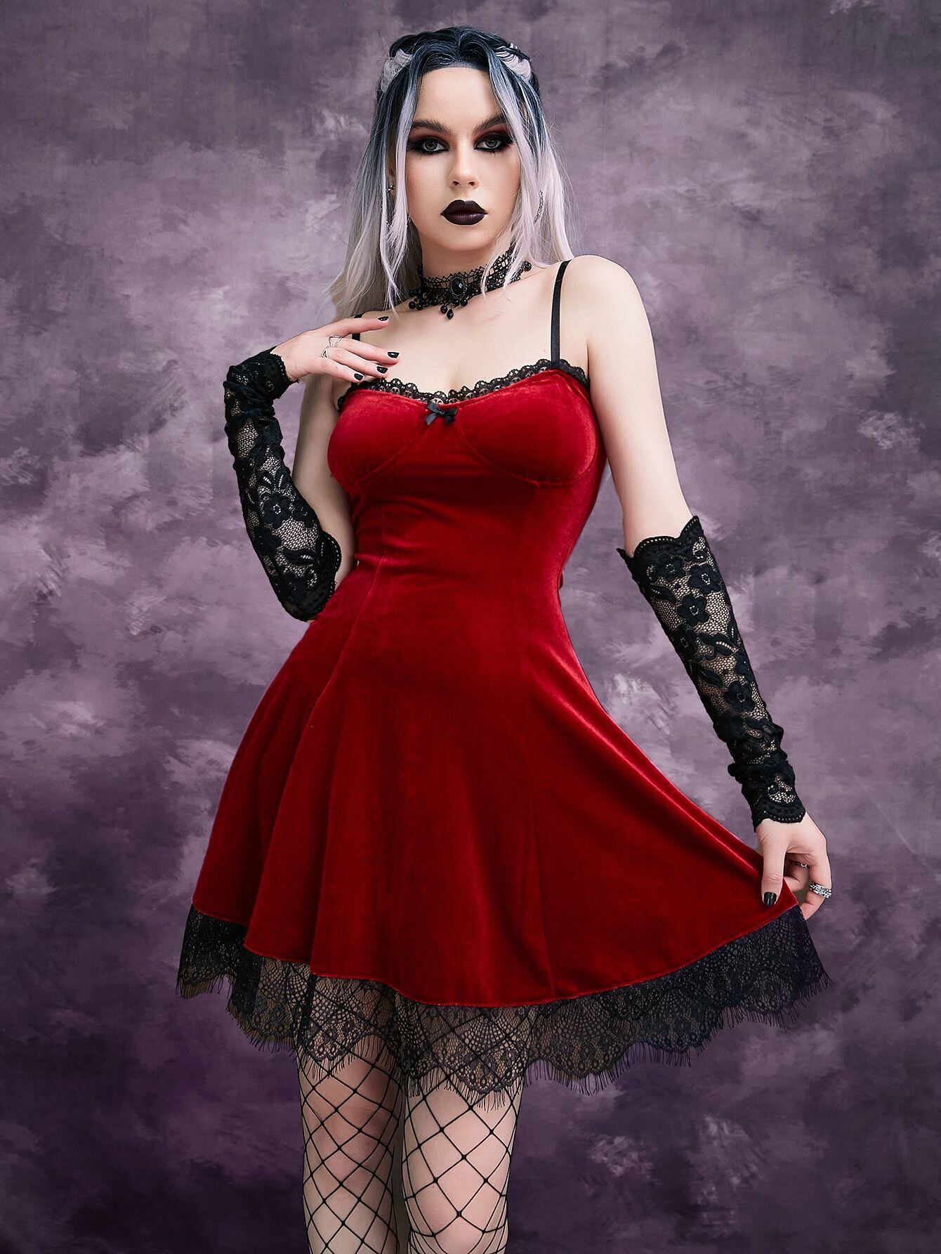 送料無料 ゴスダークヴィンテージモールゴシックベルベット A ラインドレスグランジレーストリムセクシーな女性のミニドレス背中の開いたスリムスリングパーティー Alt 服 Aライン ビンテージ AE15558877446454275