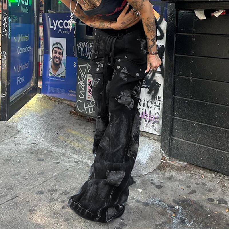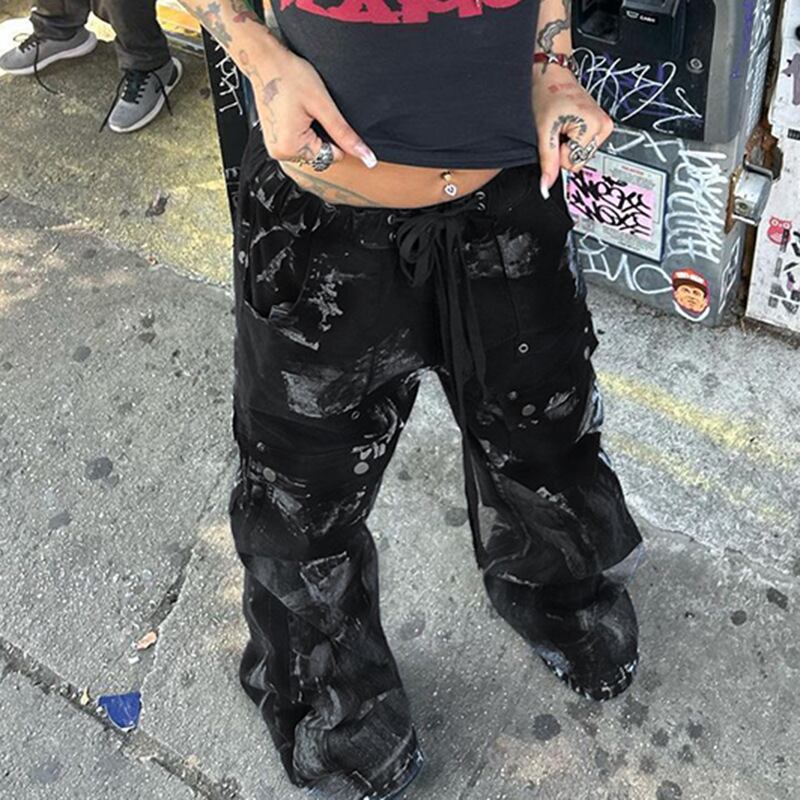 送料無料 ゴスダークタイダイプリントモールゴシックカーゴパンツ Y2k ストリートヴィンテージレースアップジーンズ女性 90 s グランジウエストズボン ビンテージ AE155588794623106845
