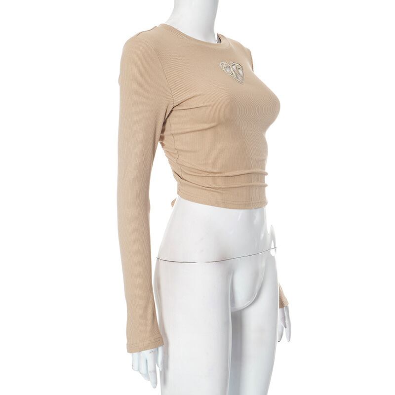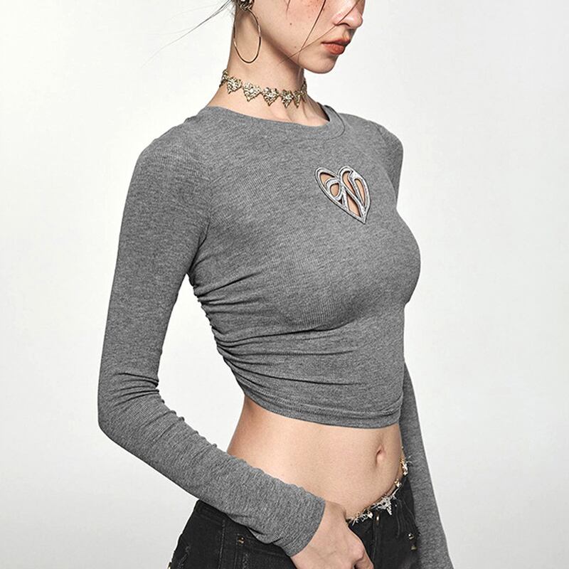 送料無料 ゴスダーク中空アウト Y2k ボディコン Tシャツゴシック背中の開いたセクシーな巾着クロップトップスリブ長袖秋 Tシャツ ロング オータム 秋物 AE155588771494419717