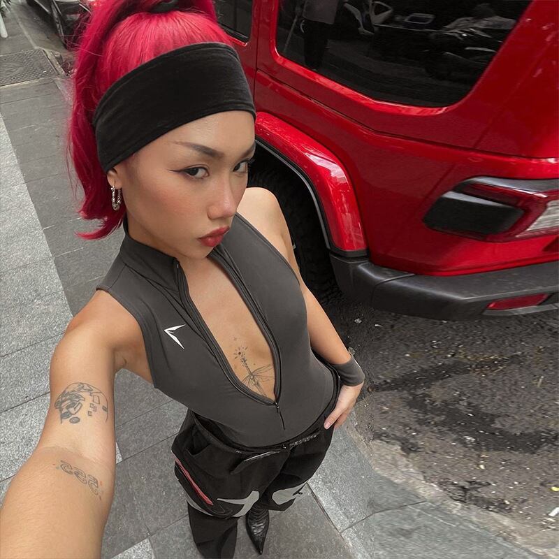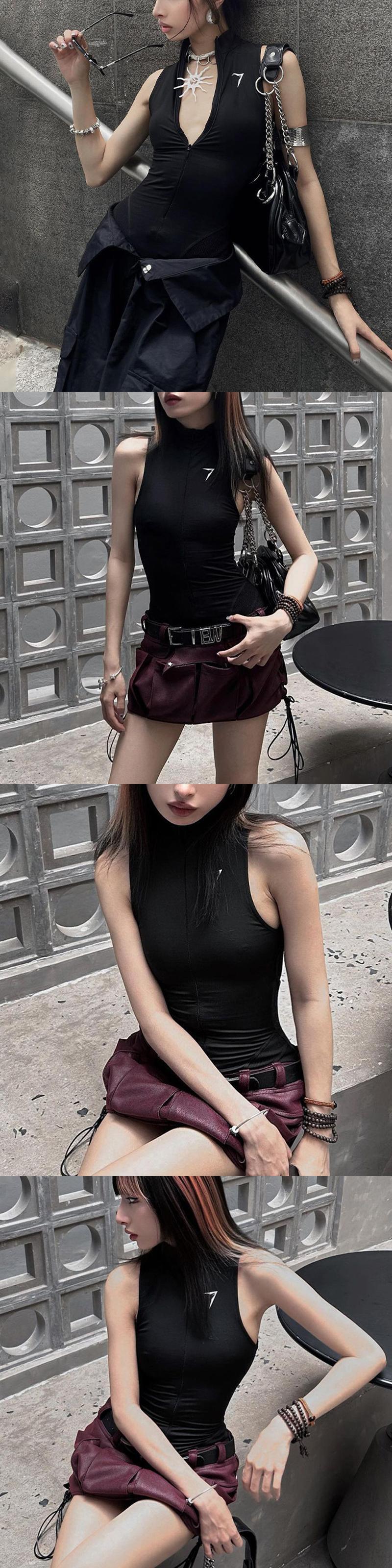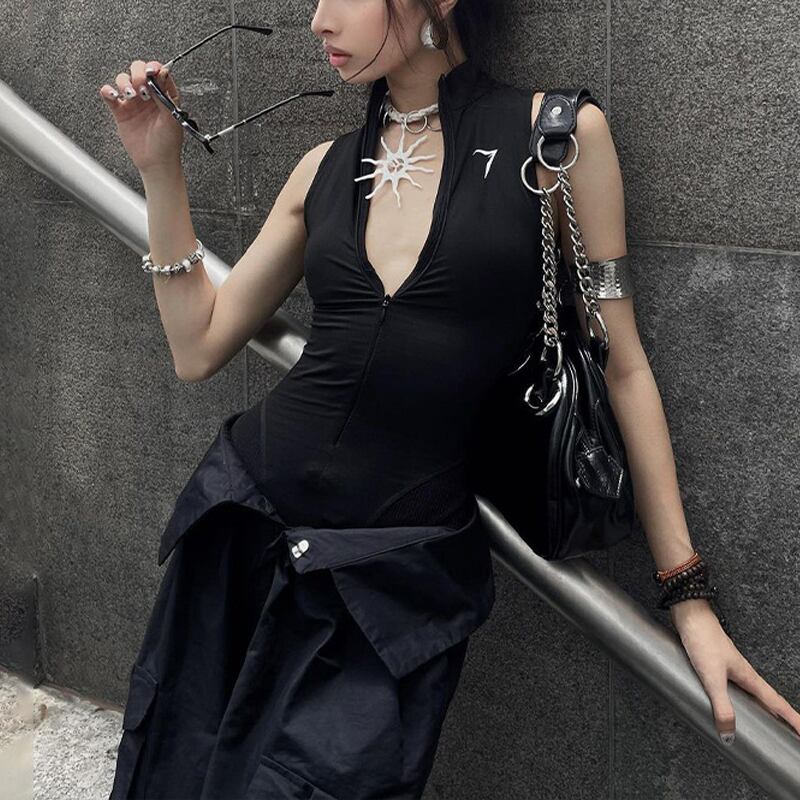 送料無料 ゴスダークサイバー Y2k パンクボディコンショーツ & 遊び着 Techwear ゴシックジッパーノースリーブロンパースセクシーな基本ボディスーツ ブルマー AE155588762193021583