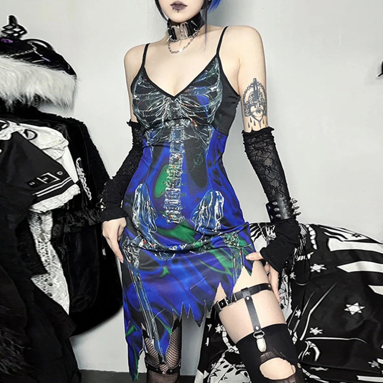 送料無料 ゴスダークサイバー Y2k パンクスケルトンプリントミニドレスゴシックグランジ美的 V ネックパーティーウェア女性のセクシーなスキニークラブナイトドレス Vネック AE155588755893945754