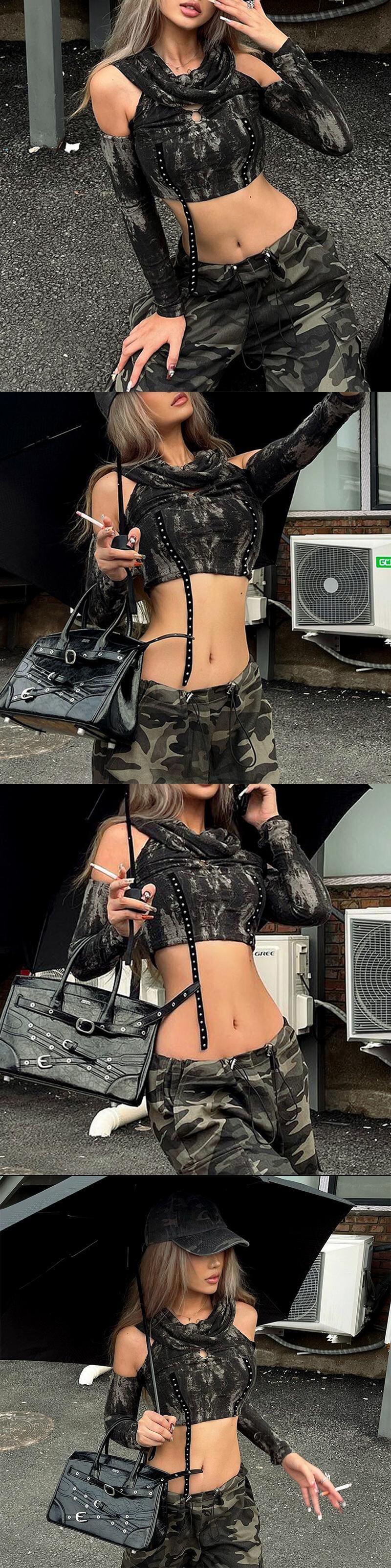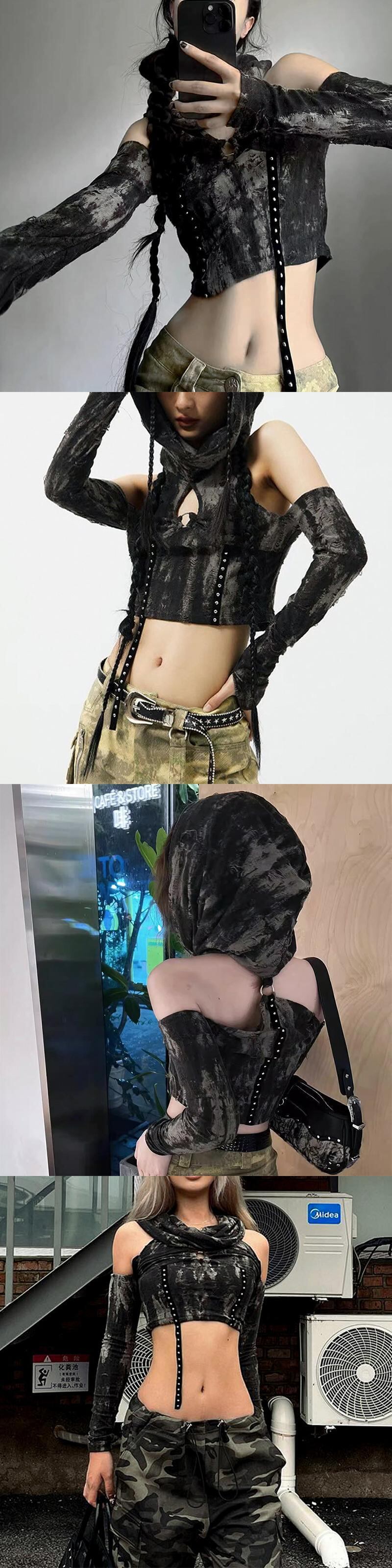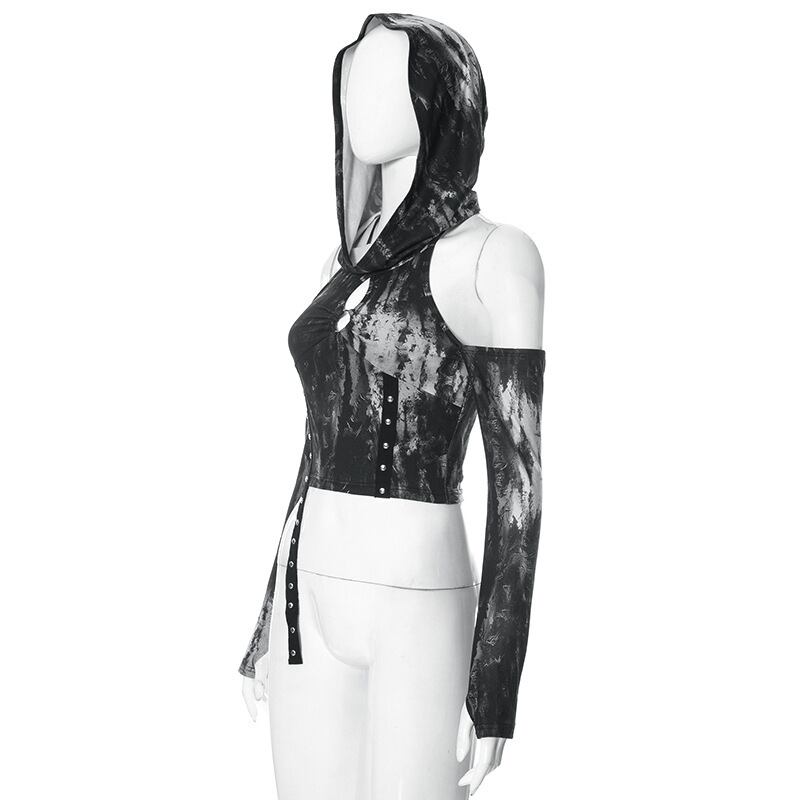 送料無料 ゴスダーク妖精グランジ美的タイダイセクシーな Tシャツサイバー Y2k モールゴシックフード付きクロップトップス女性パンク中空アウトストリート AE155588716850879266