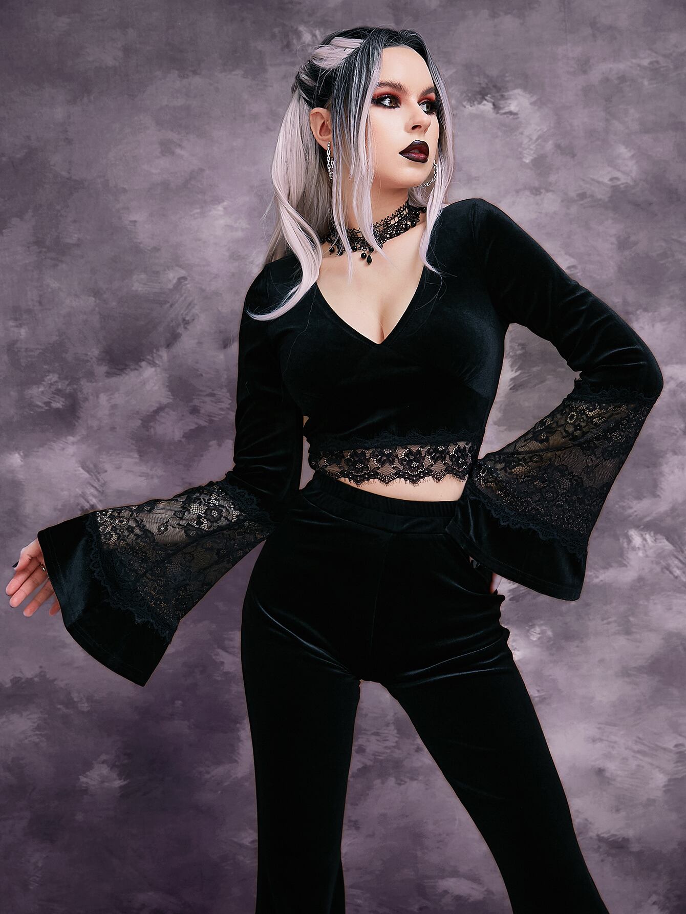 送料無料 ゴスダークベルベットモールゴシック女性ブラウスグランジ美的レース裾 V ネッククロップトップスセクシーなフレアスリーブパンク Alt Tシャツ Vネック AE155588761930680832