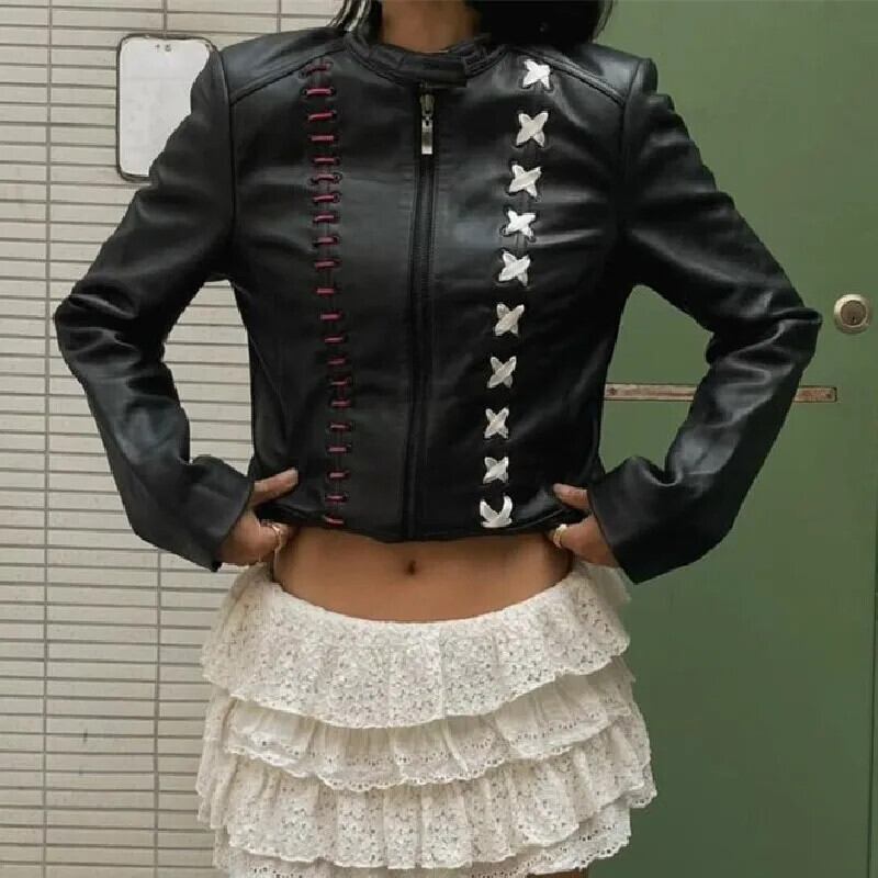 送料無料 ゴスダークグランジモトフェイクレザー Pu クロップジャケットゴシック Y2k ストリート女性コートパンク秋包帯黒生き抜く ブラック オータム 秋物 ファー AE155588769605153399