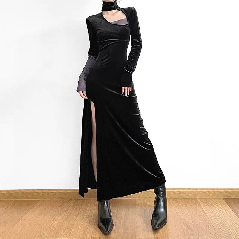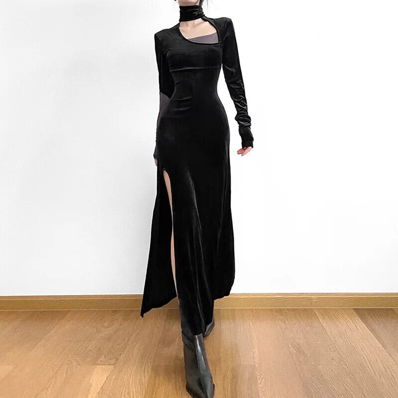 送料無料 ゴスダーク Y2k パンク背中の開いたセクシーなパーティーロングドレスサイバーゴシックタートルネックカットアウトドレス女性イブニングスプリットベルベット秋衣装 AE155588724129175471