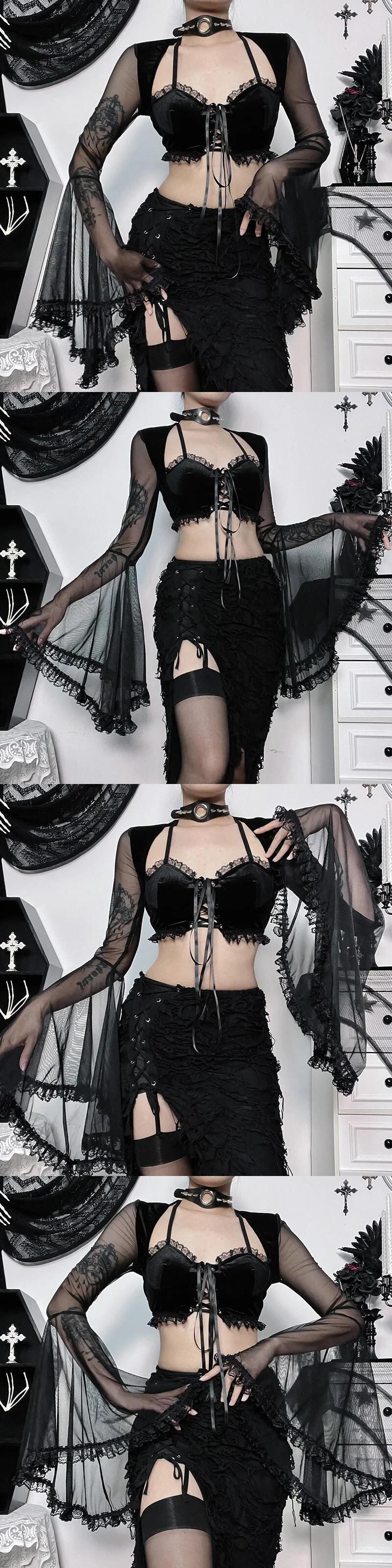 送料無料 ゴスダーク包帯モールゴシック女性クロップトップスグランジセクシーなメッシュベルベットパッチワークブラウス女性フレアスリーブalt AE15558877621233754